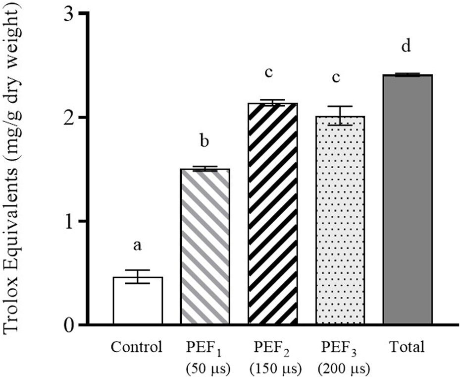 Antioxidant activity of the extract obtained after 24 h of incubation from untreated and PEF treated S. cerevisiae cells at 15 kV/cm for different times (50, 150, and 200 µs). Antioxidant activity of the S. cerevisiae cell extract after beat milling (Total) is also shown. Different letters indicate significant differences (p ≤ 0.05).
