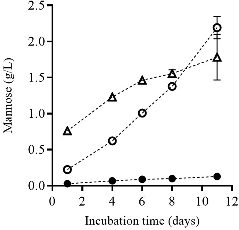 Along incubation time, the concentration of mannose in the medium in which the yeast cells were suspended was higher in the biomass that had been previously treated by PEF. Until Day 9 of incubation, the amount of released mannose was higher in the biomass subjected to the more intense PEF treatment (PEF2), but a longer incubation time did not increase it any further. However, mannose release increased by 23% in the biomass treated by PEF1. Consequently, after 11 days of incubation, the concentration of mannose was higher in the media containing the biomass treated by PEF1 than in the biomass treated by PEF2.