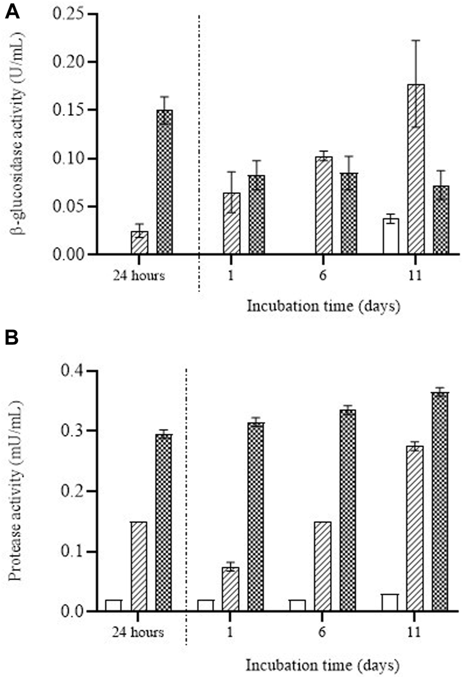 β-glucosidase activity (A) and protease activity (B) over the incubation time detected in the supernatant containing untreated (white bars) and PEF treated S. cerevisiae cells at 15 kV/cm for 50 µs (striped bars) and 150 µs (dotted bars) during the first 24 h of incubation and once the supernatant was removed after 24 h of incubation and the remaining cell biomass was re-suspended.