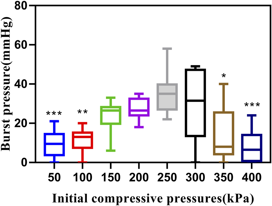 | Compressive pressure (kPa) | Success/total numbers | Burst pressure (mean ± SD) (mmHg) | Highest burst pressure (mmHg) | Burst pressure range (mmHg) |