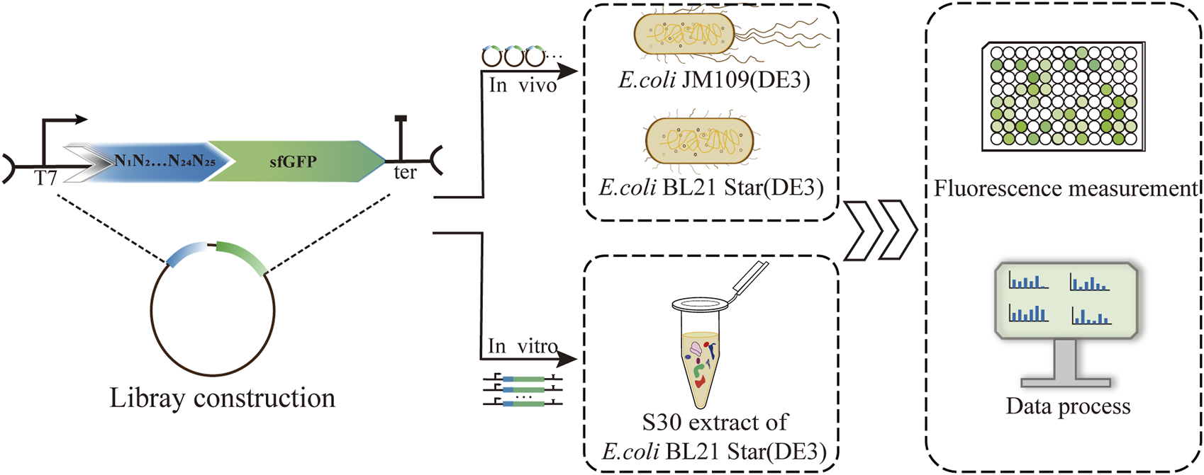 We generated a library of plasmids with 5′-UTRs containing a 25 nucleotides long randomized region directly upstream of the start codon. Firstly, the upstream primer 25N-F and downstream primer 25-R were synthesized, annealed and amplified using the Primer STAR Max premix (TaKaRa). The PCR was performed with one cycle of 98°C (10 s), 55°C (5 s), and 72°C (1 h) followed by cooling to 10°C. Secondly, the linearized vector was obtained from the original plasmid pUC19-nonRBS-sfGFP constructed in our laboratory by PCR amplification using the V19-F and V19-R. Then, the amplified PCR products were purified using a Tian quick PCR Purification Kit (Qiangen) or Tian quick Gel Extraction Kit (Qiangen). Finally, the recombinant plasmids were assembled using the ClonExpress II One Step Cloning Kit (Vazyme Biotech Co., Ltd.) and transferred into the competent E. coli JM109 (DE3) cells. Libraries were cultivated overnight on the LB plate with ampicillin for until single colonies appeared. The cultured plates were placed in a refrigerator at 4°C for the subsequent activity measurements.