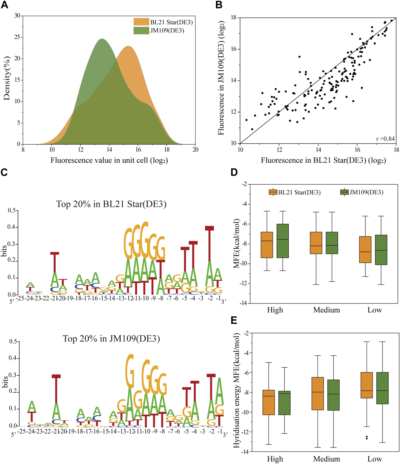 The correlation of the translation initiation strengths of the unbiased 5′-UTR library in E. coli JM109 (DE3) and BL21 (DE3) in vivo. (A) The distribution of absolute fluorescence values of the unbiased 5′-UTR library containing 160 unique sequences in both strains. (B) The correlation of absolute fluorescence of 160 5′-UTR variants between the two strains (Pearson’s r = 0.84). (C) Sequence logos were calculated for the Top 20% tested sequences in each strain. (D) Distributions of the minimal free energy (MFE) of the secondary structure folding for 5′-UTRs with different fluorescence levels between the two strains. (E) Distributions of the minimal hybridization energy of the 5′-UTR fragments with the anti-SD sequence ACCUCCUUA at the 3′end of the 16S rRNA between the two strains. We defined absolute fluorescence levels above 16.2 as high activity, those absolute fluorescence levels between 13.2 and 16.2 as medium activity, and those below 13.2 as low activity.