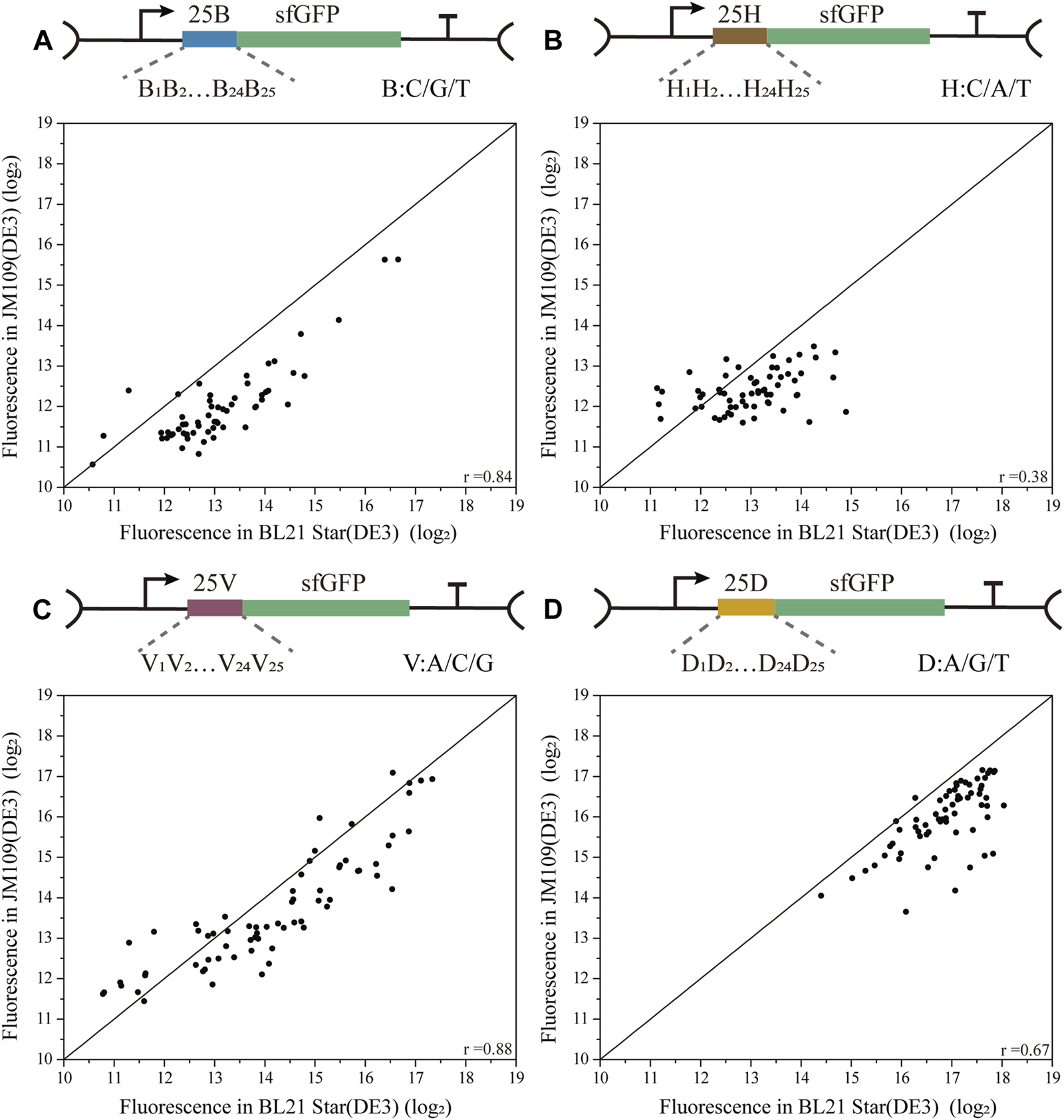 Correlation analysis of four biased 5′-UTR libraries in E. coli BL21 Star (DE3) and JM109 (DE3). (A) The 25 B library contained 59 unique 5′-UTRs with 25 continuous degenerate bases B, where B stands for C/G/T (Pearson’s r = 0.84). (B) The 25H library contained 63 unique 5′-UTRs with 25 continuous degenerate bases H, where H stands for C/A/T (Pearson’s r = 0.38). (C) The 25V library contained 68 unique 5′-UTRs with 25 continuous degenerate bases V, where V stands for A/C/G (Pearson’s r = 0.88). (D) The 25D library contained 66 unique 5′-UTRs with 25 continuous degenerate bases D, where D stands for A/G/T (Pearson’s r = 0.67). The correlation analysis of these four libraries between BL21 Star (DE3) and JM109 (DE3) is based on the analysis and comparison of absolute fluorescence values.