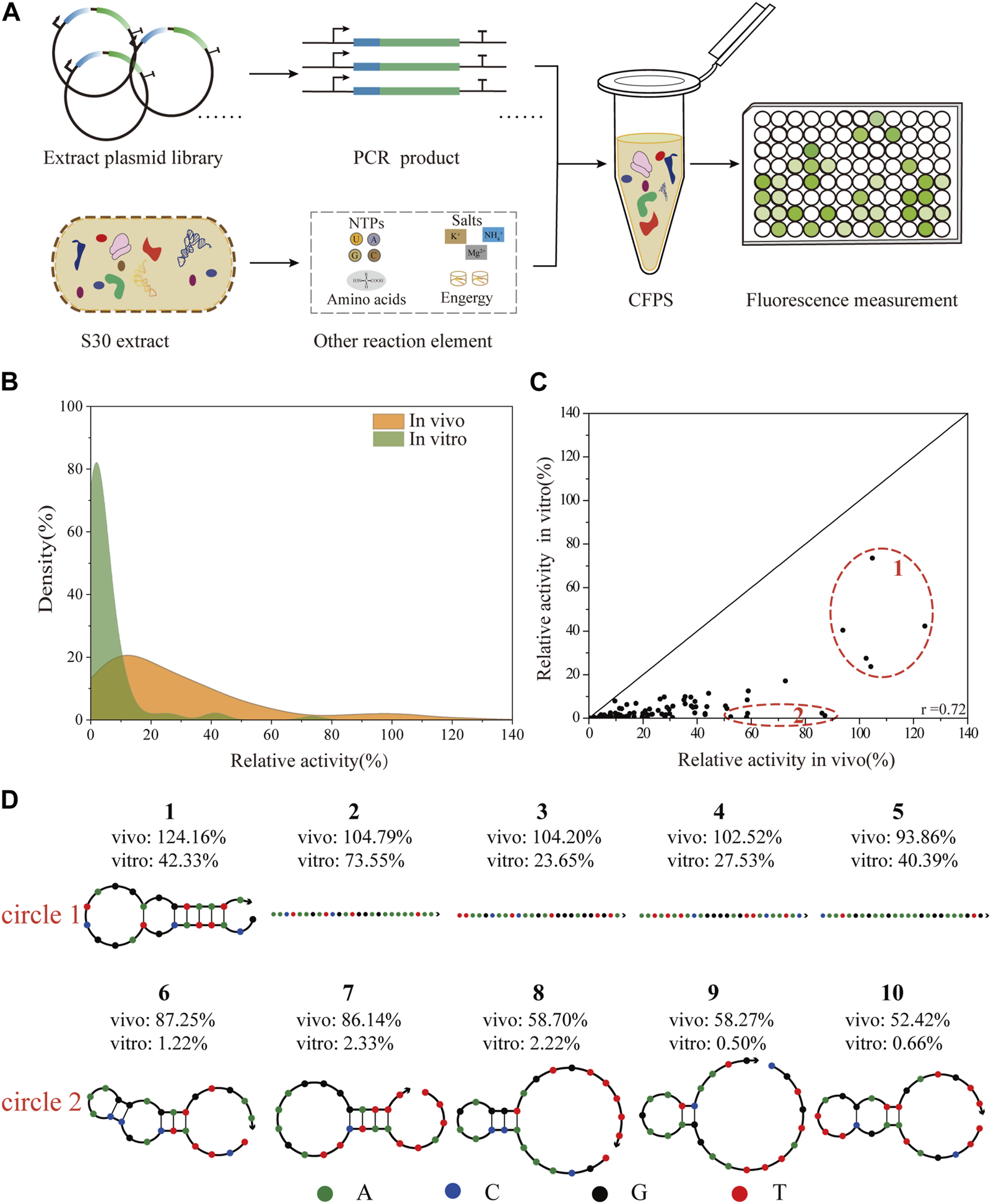 Correlation analysis of the translation initiation strengths of 5′-UTRs between in vivo and in vitro systems. (A) Scheme of the vitro protein expression system. The CFPS system was performed in a single tube containing the S30-based extract, energy sources, nucleotides, amino acids, salts, cofactors, linear DNA, and water/buffer to maintain the reaction. The expression level of sfGFP was determined by direct fluorescence measurement. (B) The distribution of the relative translation activities of 93 unique 5′-UTRs between in vivo and in vitro system. (C) The correlation analysis of 93 unique 5′-UTRs sequences in BL21 Star (DE3) in vivo and in vitro (Pearson’s r = 0.72). (D) The secondary structures of five sequences (number 1- number 5) with the highest activity in vivo and in vitro, and five sequences (number 6—number 10) with high activity in vivo but low activity in vitro were respectively selected.