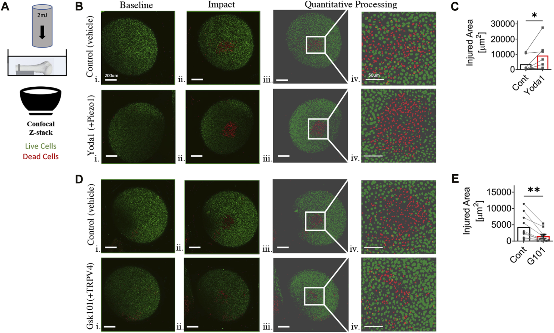 Ethical approval was obtained by the institutional UCAR committee (Protocol #2019-008). Humeri were harvested from wild-type 12-22 week old C57Bl/6 male mice. Each specimen was placed in calcium imaging buffer with 2 mM calcium chloride and subsequently incubated with 10uM calcein-AM for 30 min at 37°C to indicate intracellular esterase activity of living cells. Specimens were then incubated with 10uM yoda1, a PIEZO1-specific agonist, 5 nM GSK101, a TRPV4-agonist, or control (DMSO 0.25%, n = 7-10/group) in calcium imaging buffer for 15 min. Specimens were then incubated with 1.5 nM ethidium homodimer-1 for 3 min to indicate loss of plasma membrane integrity in dead cells. The specimen was then arranged in a custom 3-D printed holding device such that the chondrocytes within the apex of sphericity of the humeral head were facing the glass well of a dish to be imaged on an inverted confocal microscope. A baseline confocal image with overlay of 100um Z-stacks was obtained with 488 and 594 nm wavelengths to image live and dead cells, respectively. The humerus was then transferred to a custom impact loading apparatus (Figure 1A). A 2mJ load was applied to the lateral aspect of the proximal humerus, such that the convex apex of the humeral head cartilage was impacted against the glass microscope dish. A 2mJ load was selected based on preliminary work by Kotelsky et al. (2019) to define mechano-vulnerability of distal femur and proximal humerus articular chondrocytes in the custom loading apparatus. The samples were again incubated in ethidium homodimer-1. A post-injury confocal image with overlay of 100 um Z-stacks was obtained. A custom MATLAB image processing algorithm was developed to quantify cell viability. The confocal images were processed as maximum intensity projections with threshold via Otsu’s method. Then, watershed segmentation, distance transform, and centroid approximation algorithms were created and applied to segment and quantify individual cells based on intensity values. This facilitated the cell counting process, allowed quantification of the total cell area, and allowed adjustment of the region of interest between before- and after-impact micrographs.