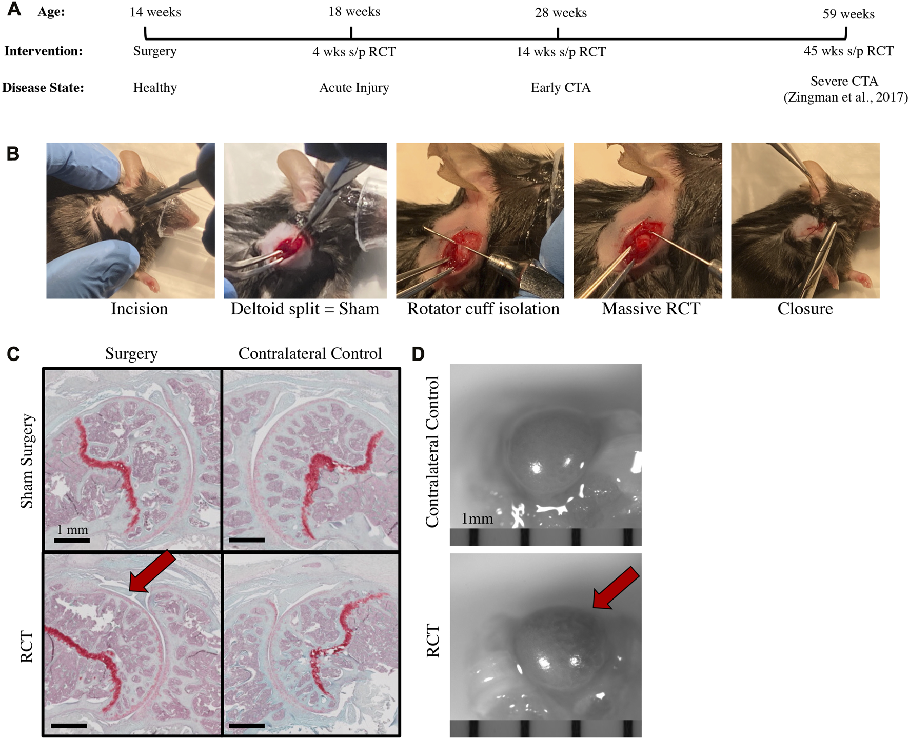 Rotator cuff tear (RCT)-induced mouse model of CTA with histologic & pathologic specimens 14 weeks post-injury. (A) Timeline of intervention, experimental analysis, and anticipated disease status with regards to OA including analysis of acute injury at 4 weeks post-injury, early CTA at 14 weeks post-injury, and reference to late-stage CTA at 45 weeks post-injury (Zingman et al., 2017). (B) Images representing surgical steps to produce massive RCT in mice. (C) Safranin-O histology of (top left) Sham, (top right) Sham Control, contralateral limb, (bottom left) RCT with humeral head flattening indicated by red arrow, and (bottom right) RCT Control, contralateral limb, scale bar = 1 mm. (D) Images of gross pathology specimens of (top) RCT Control, contralateral limb and (bottom) RCT with bone bruise indicated by red arrow, scale bar = 1 mm.