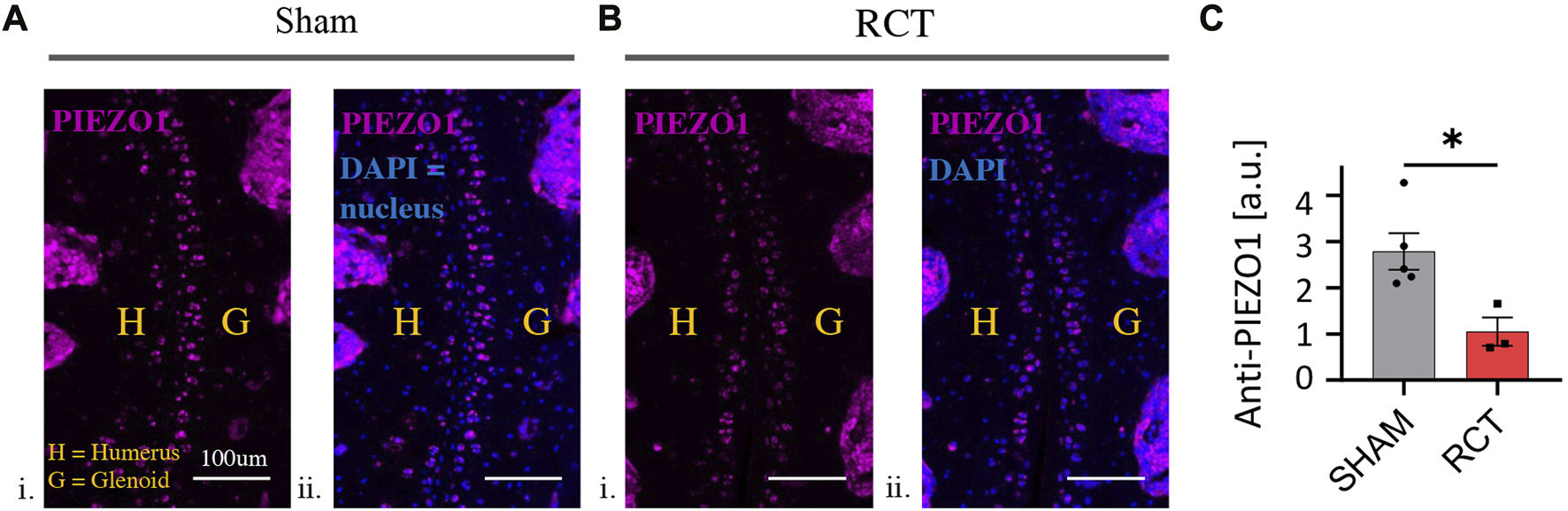 PIEZO1 expression levels 14 weeks status post RCT.(A) Representative immunofluorescence images of sham control limbs. i. PIEZO1 expression with humerus and glenoid labeled, scale bar = 100 μm ii. PIEZO1 expression with DAPI staining for cell nuclei, with humerus and glenoid labeled, scale bar = 100 μm. (B) Representative immunofluorescence images of RCT-injured limbs. i. PIEZO1 expression with humerus and glenoid labeled, scale bar = 100 μm ii. PIEZO1 expression with DAPI staining for cell nuclei, with humerus and glenoid labeled, scale bar = 100 μm. (C) Quantification of PIEZO1 expression between control and RCT. Significance of *p < 0.05 with unpaired Student’s t-test, indicating a decrease in expression.