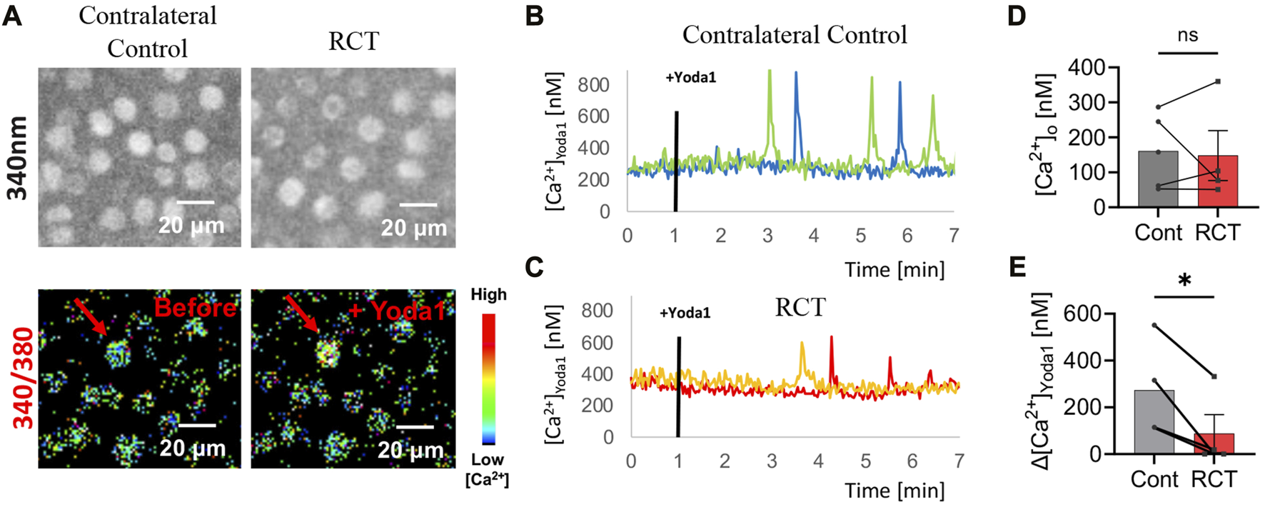 PIEZO1 functional expression 14 weeks status post RCT. (A) Representative Fura2 load micrographs: (top) 340 nm excitation, (bottom) ratiometric (340 nm/380 nm) image with pseudo colors. (B) Representative intracellular Ca2+ concentration of contralateral control mice following Yoda1 treatment 1min in situ with blue and green lines representing two of four biologic replicates. (C) Representative intracellular Ca2+ concentration of RCT injured mice following Yoda1 treatment 1min in situ with red and orange lines representing two of four biologic replicates. (D) Average resting [Ca2+]o and (E) average Yoda1 (40 μM)-induced Δ[Ca2+]Yoda1 in contralateral control limb compared to RCT-injured limb, no significant differences in [Ca2+]o and significantly reduced Δ[Ca2+]Yoda1 in RCT-injured limb versus contralateral control limb. *p < 0.05, **p < 0.01; paired Student’s t-test.