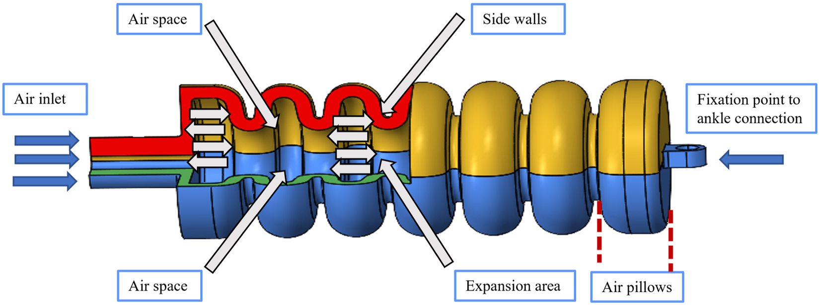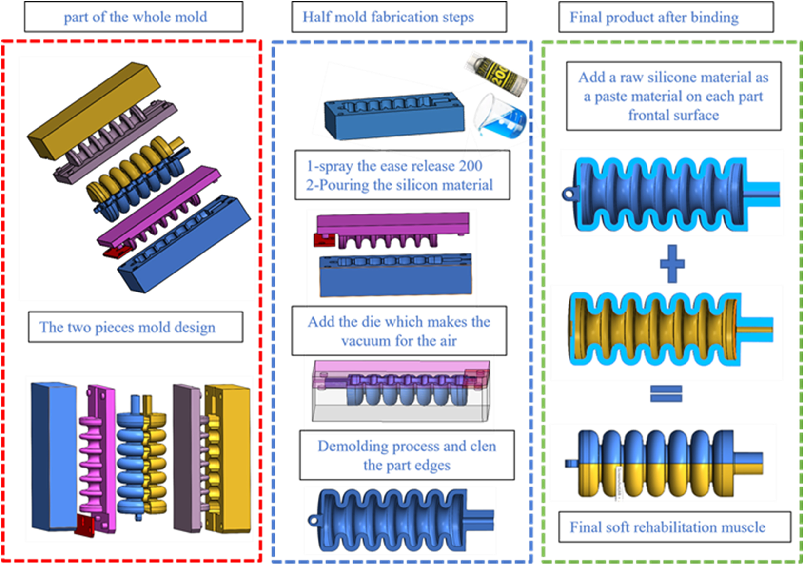 In order to achieve this goal, the correct selection and optimization of the shape and silicone material properties of the mold and silicone material are essential. Because of its elasticity, durability, and biocompatible properties, silicone is an ideal material for prolonged contact with the human body. In addition, silicone enables silicone to be easily molded into custom shapes, allowing soft muscle development to be tailored to an individual’s specific needs and anatomical structure. It also allows for customization. Incorporating air pillows into soft muscle designs precisely controls muscle expansion and contraction. By manipulating the air pressure in the soft muscle, the appropriate level of support or resistance can be imparted during ankle exercises, thus facilitating patient-specific rehabilitation protocols. Additionally, the presence of air pillows increases the comfort of soft muscles, allowing them to adapt to the wearer’s movement accurately. Furthermore, air pillows enhance its overall compliance, allowing it to seamlessly adjust to the wearer’s movements, minimizing any discomfort or inconvenience.