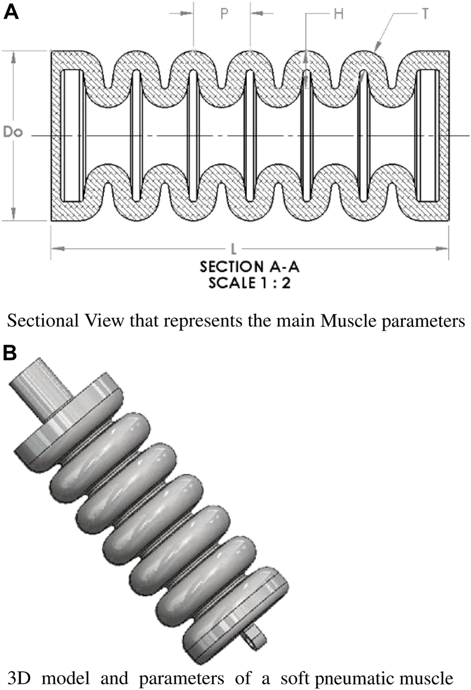 Visualization and Parameter Analysis of a Soft Pneumatic Muscle. The figure provides a comprehensive depiction of the soft pneumatic muscle, emphasizing its design features and significant parameters. (A) a sectional view is presented, elucidating the main muscle parameters. (B) Showcases the detailed 3D model and associated parameters of the soft pneumatic muscle.