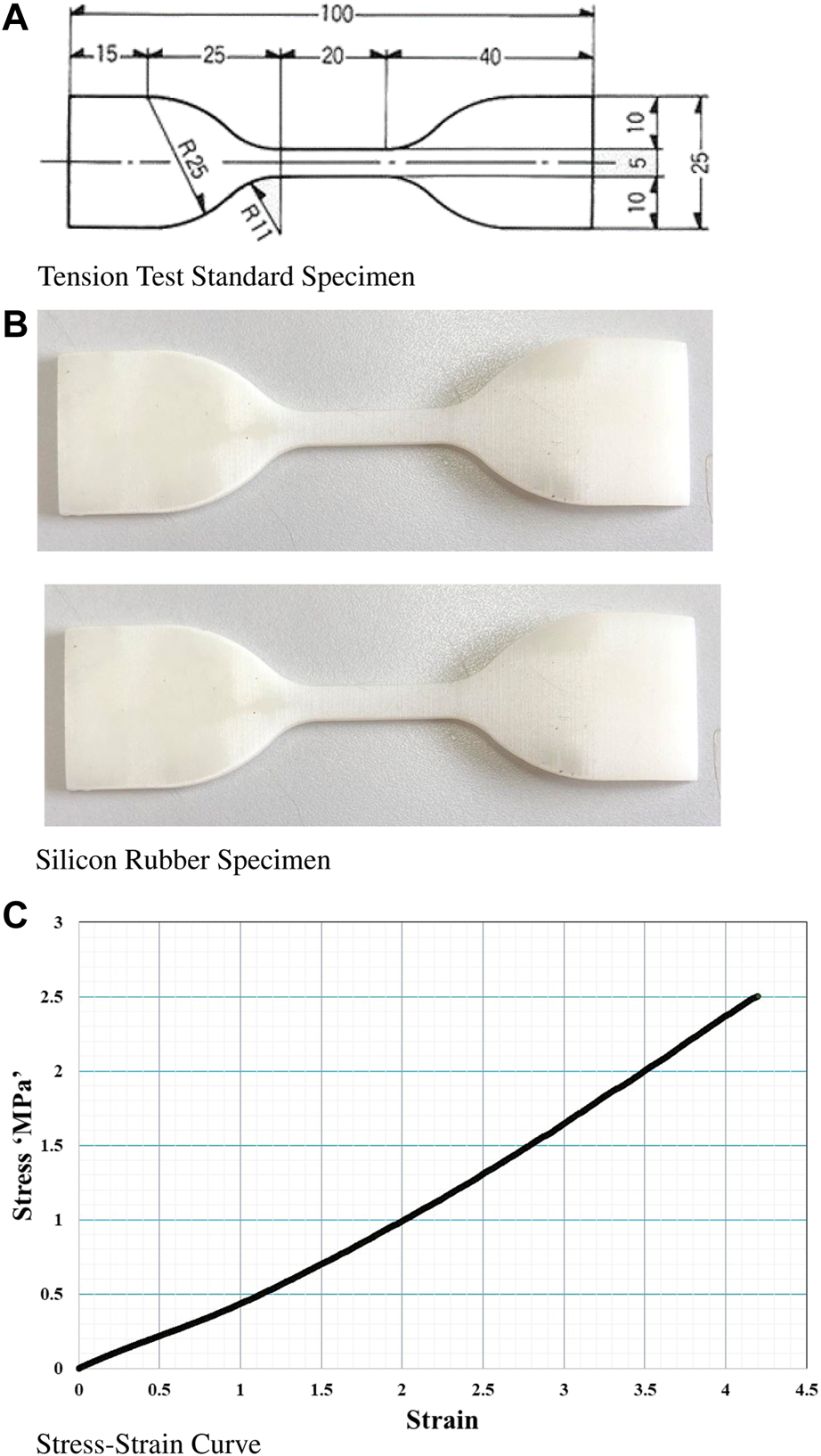 (A) Geometrical dimensions and manufacturing of ASTM D412 specimens of Silicone rubber material. (B) Fabricated ASTM D412 specimen of Silicone rubber after curing. (C) Experimental results: Stress-strain curve for the tested Silicone rubber material.