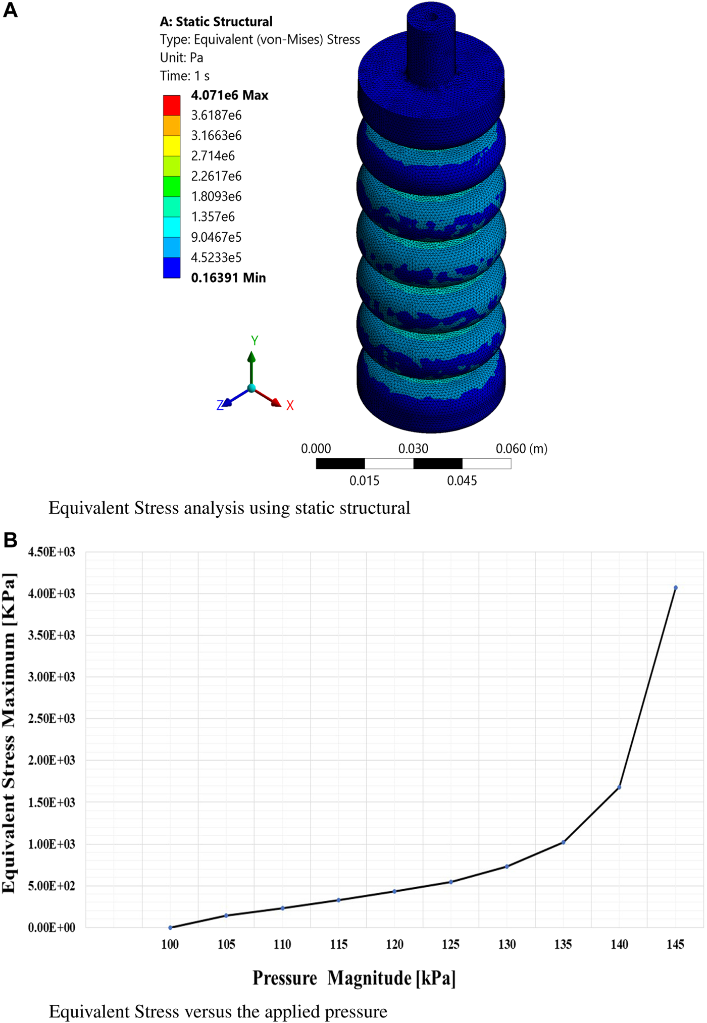 Finite element analysis of equivalent stress. (A) Static structural simulation results for equivalent stress at maximum pressure based on the Yeoh hyperelastic model. (B) Equivalent stress as a function of applied pressure.