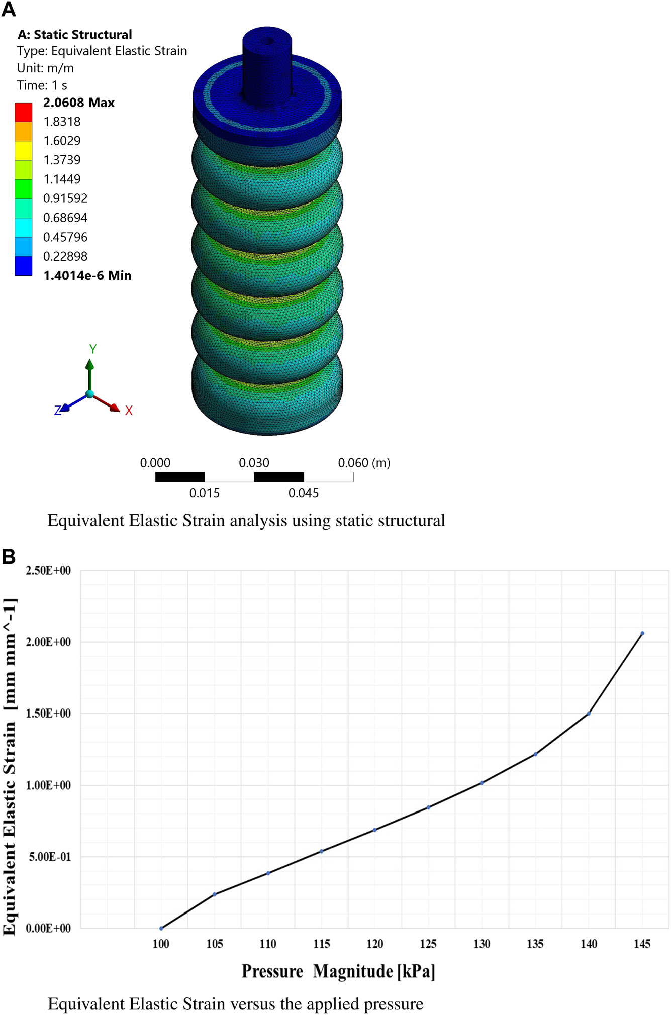 Finite element analysis of equivalent elastic strain. (A) Static structural simulation results for equivalent elastic strain at maximum pressure. (B) Equivalent elastic strain as a function of applied pressure.