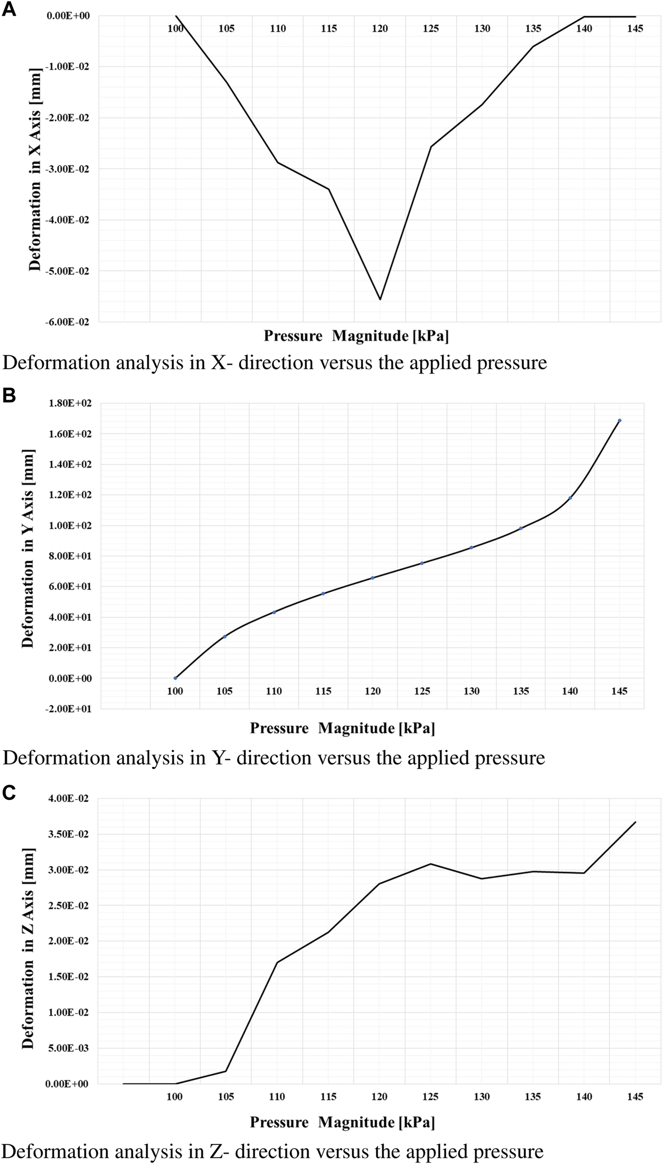 Finite element analysis of deformation in the x, y, and z directions. (A) Deformation in the x-direction as a function of applied pressure. (B) Deformation in the y-direction as a function of applied pressure. (C) Deformation in the z-direction as a function of applied pressure.