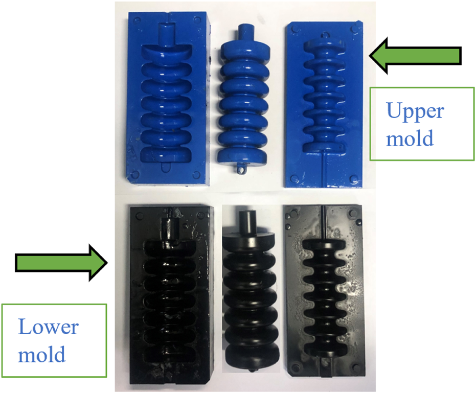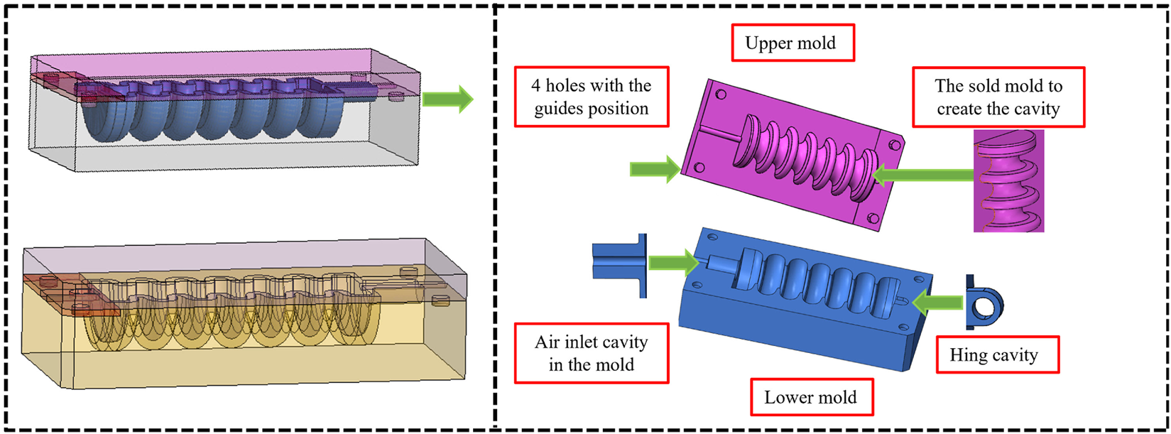 The manufacturing process includes the use of silicone-based materials and the creation of a hollow soft muscle model using two distinct 3D printed molds, as shown in Figures 9, 10. Each mold has a lower section of silicone material and an upper section of the cavity space for air pillows that form the cavity. It consists of a lower section where the silicone material is poured and an upper section which is the cavity space for the air pillows. The lower mold has four holes, while the upper mold has four guiding bars, which ensure optimal symmetry in the finished product. The upper mold includes four holes, and the upper mold is equipped with four guiding bars. The ease-release material is carefully applied to both molds to begin the process, facilitating subsequent removal of the shaped soft muscle without any trouble. The silicon material and the silicone curing agent are mixed precisely in a ratio of 100:2 g to obtain a homogeneous mixture. This well-balanced composition is carefully poured into the lower mold; the upper and lower molds are tightly closed and secured. The curing process involves exposing the mold to vacuum pressure in a vacuum oven while maintaining a temperature of 40°C. It also involves exposing it to pressure. The next step involves unsealing the upper and lower molds, which reveals the half-muscle, which can then easily be joined to its corresponding counterpart as shown in Figure 10.