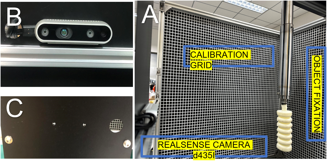 The experiment platform for measuring the elongation in the Y-axis regarding the pressure head change (A) The experiment space where the soft muscle fixed from one end in 3D space, (B) the real sense D435i camera detecting a video for the movement, and (C) the laser cut plate for camera fixation.
