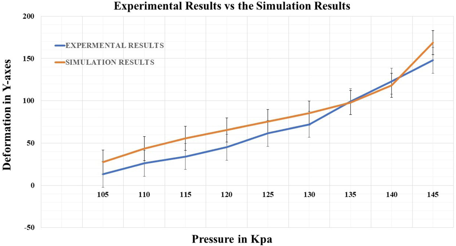 Demonstrates the correlation between the deformation in the Y-axis with respect to the change of the pressure in the Simulation compared to experimental tests.
