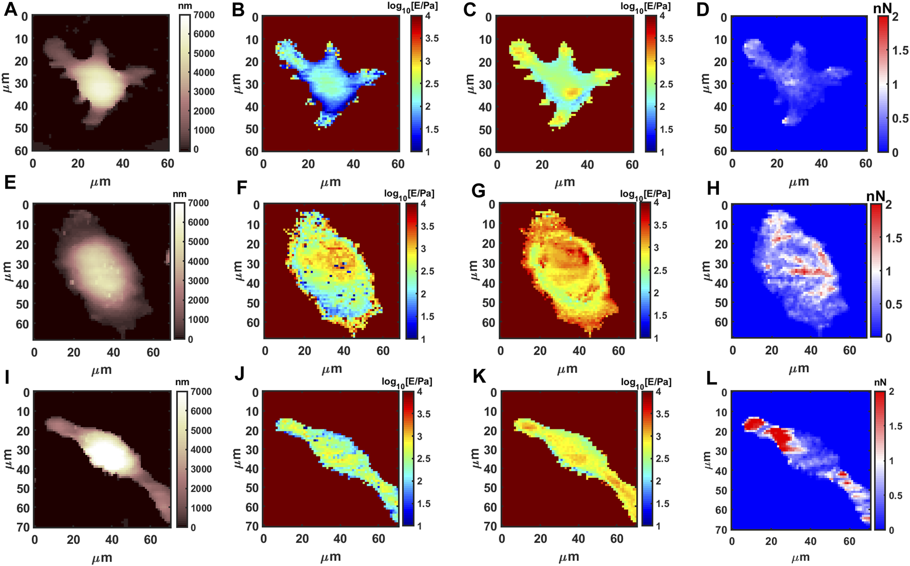 AFM measurements for resting and polarized macrophages. Morphology, shallow Young’s Modulus (MechL), deep Young’s Modulus (MechH) and adhesion maps for RAW 264.7 @37C, respectively, M0 phenotype (A–D), M1 phenotype after 1 μg/mL LPS (E–H), and M2 phenotype after 0.1 μg/mL IL-4 stimulation (I–L).