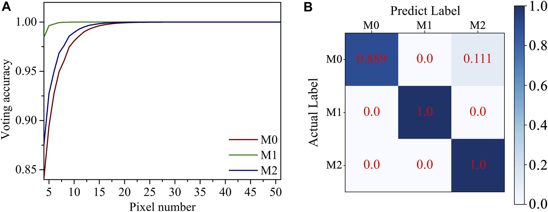 The theoretical prediction voting accuracy for phenotype increases as the pixel number on the macrophage increases. The theoretical voting accuracies of M0, M1, and M2 macrophages are higher than 99.9% when the pixel number in a macrophage is higher than 20, 7, and 17, respectively. In the real voting process, the predictions of pixel positions are not independent, so the pixel number thresholds for three kinds of macrophages are different. The average pixel numbers of M0, M1, and M2 macrophages in the test set are 104, 334, and 134, respectively, as shown in Supplementary Table S1. The real voting accuracy of macrophages in this work for M0, M1, and M2 macrophages is 88.9%, 100%, and 100%, respectively. As explained in the previous section before applying pixel voting, inflammatory phenotype M1 is clearly well-distinguishable, while the misclassification may come from the similarity between M0 and M2 in modulus and shape.