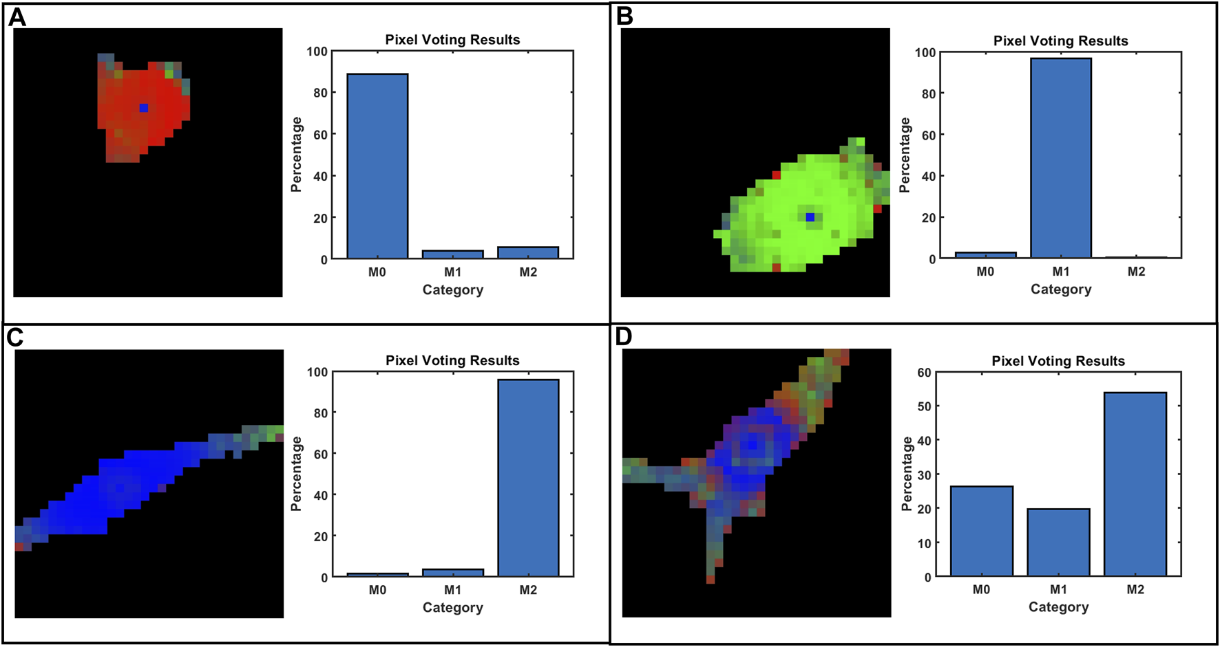 Some representative voting and classification results on selected cells: (A) M0, (B) M1, (C) M2, and (D) M2 with poor classification. The pixel predictions of the trained DNN model were artificially colored red for M0, green for M1, and blue for M2.