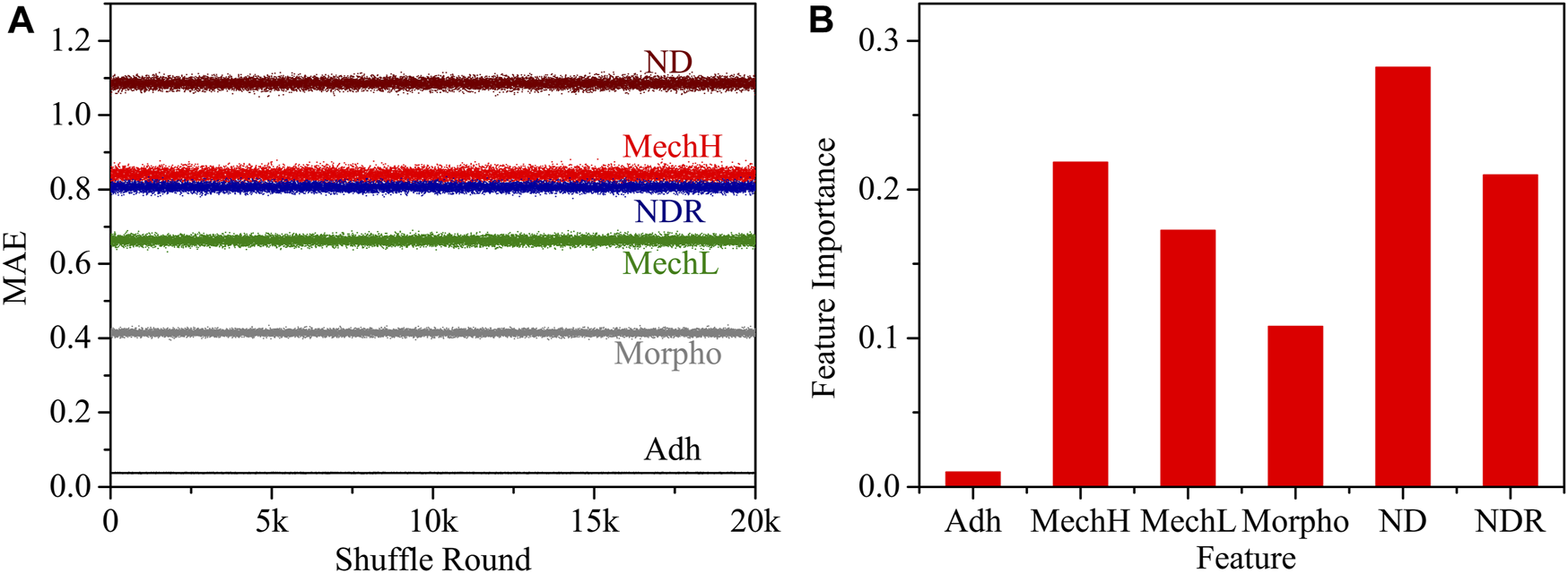 (A) The relationship between the MAE of each feature and the shuffle round; (B) the normalized feature importance.