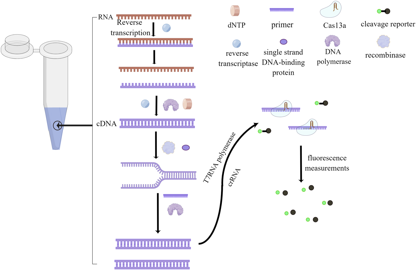 Step-by-Step Visualization of One-Tube Nucleic Acid Amplification. The process begins with the use of reverse transcriptase to convert RNA into complementary DNA (cDNA), forming a DNA-RNA hybrid chain. Reverse transcriptase then degrades the RNA, and DNA polymerase synthesizes the second cDNA strand using dNTP as a substrate. Recombinase opens the double-stranded DNA, and Single-Stranded Binding (SSB) proteins temporarily stabilize the single strand, facilitating the creation of a new complementary DNA strand through the action of primers and DNA polymerase. Subsequently, T7RNA polymerase transcribes the DNA into RNA, with crRNA guiding the Cas13a protein to bind to the target nucleic acid, resulting in the formation of a ribonuclease complex. This ribonuclease complex possesses cleavage activity, which is employed to cleave a probe. Finally, fluorescence is utilized for reading and detecting the results. This figure was drawn by Figdraw.
