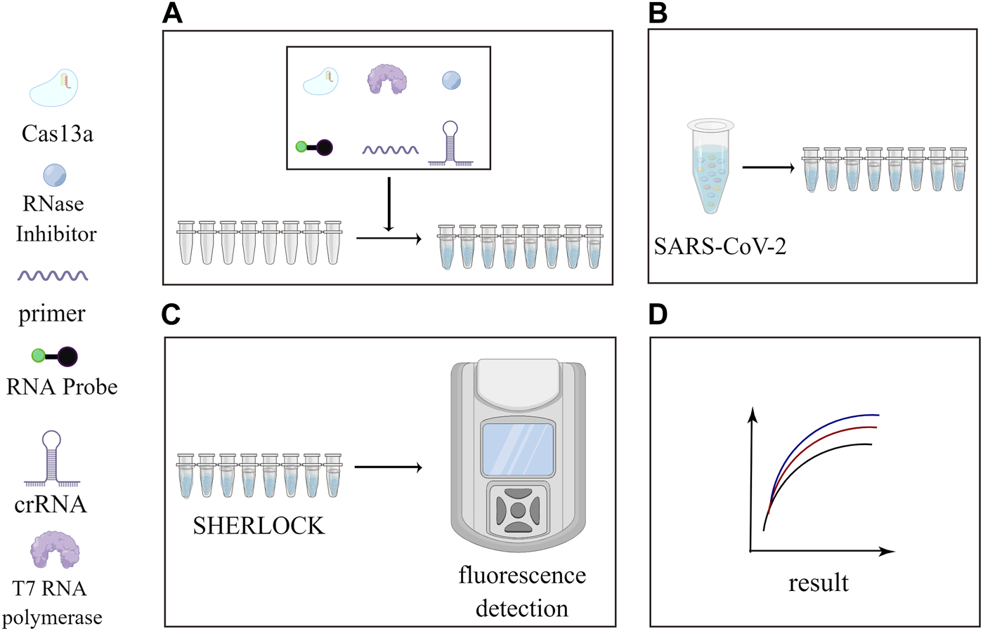 Application of SHERLOCK in the detection of SARS-CoV-2. This figure was drawn by Figdraw. Subfigure (A): Cas13a, cleavage reporter, RNase Inhibitor, crRNA, primer, T7 RNA polymerase and other reagents were added to each of the eight consecutive tubes at a certain ratio. Subfigure (B): Add a quantity of SARS-CoV-2 to each tube. Subfigure (C): Perform the reaction using the SHERLOCK platform and view the fluorescence curve in the fluorometer. Subfigure (D): Fluorescence curves obtained.