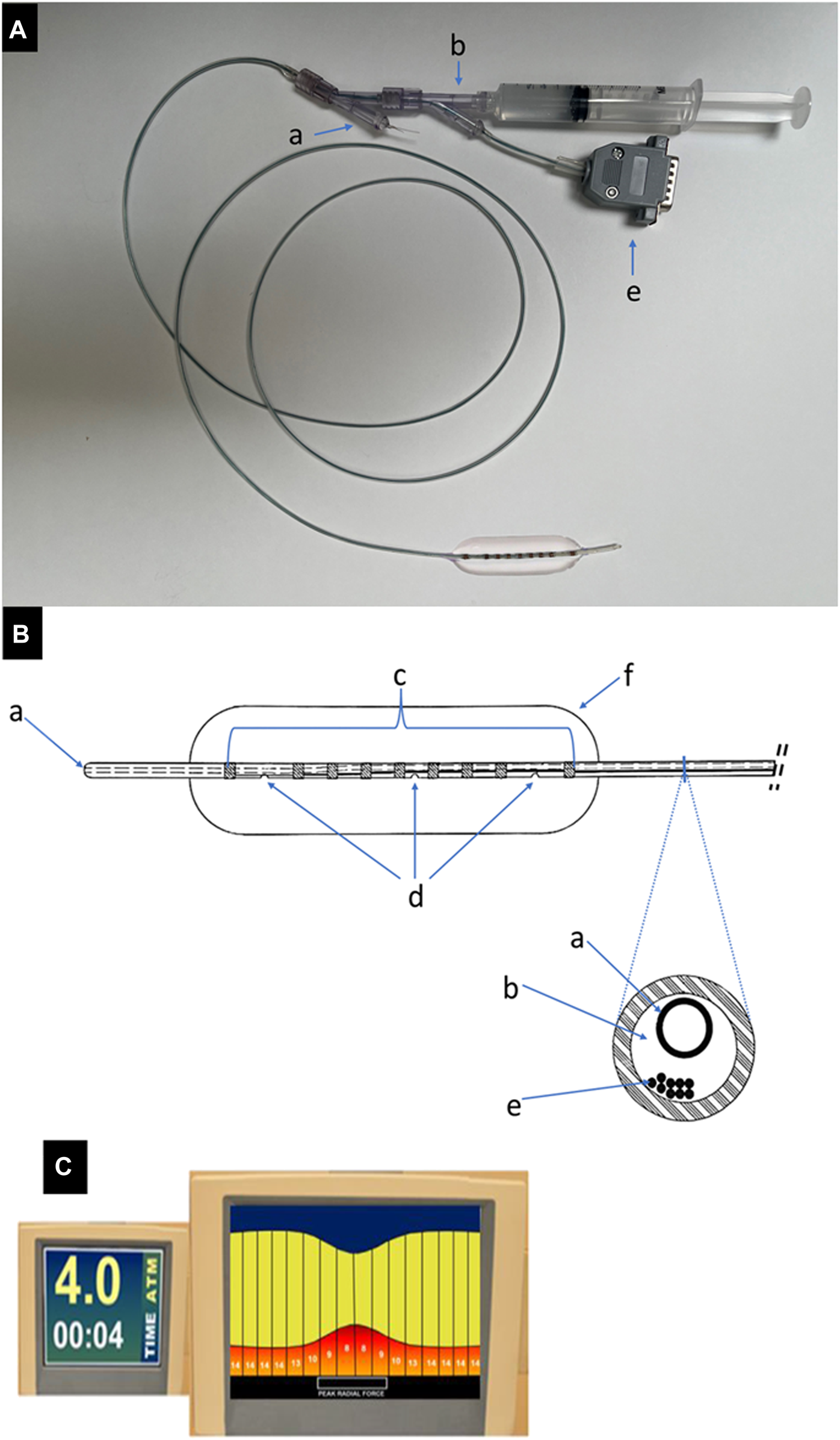 The CMSB system. (A). An example of the CMSB system (catheter diameter 5 Fr, length 140 cm and balloon diameter 15 mm) with the guidewire channel (a), filling and pressure channel (b) and impedance connector cable (e). (B). The line drawing of the distal balloon part of the CMSB system. (a): guidewire channel; (b): filling and pressure channel; (c): copper electrodes, the device has multiple electrode pairs along the length of the balloon to provide a complete profile over the 8 measurements; (d): filling and pressure ports, (e): electrode wires (impedance connector cable), (f): built-in flexible balloon. (C). The console is a monitor and data acquisition system that 1) Generates the current across the outer electrodes, 2) Measures voltage drops across the inner electrodes, 3) Calculates the balloon sizes based on Ohm‘s Law, and 4) Displays the sizing profile data in real-time on the screen.