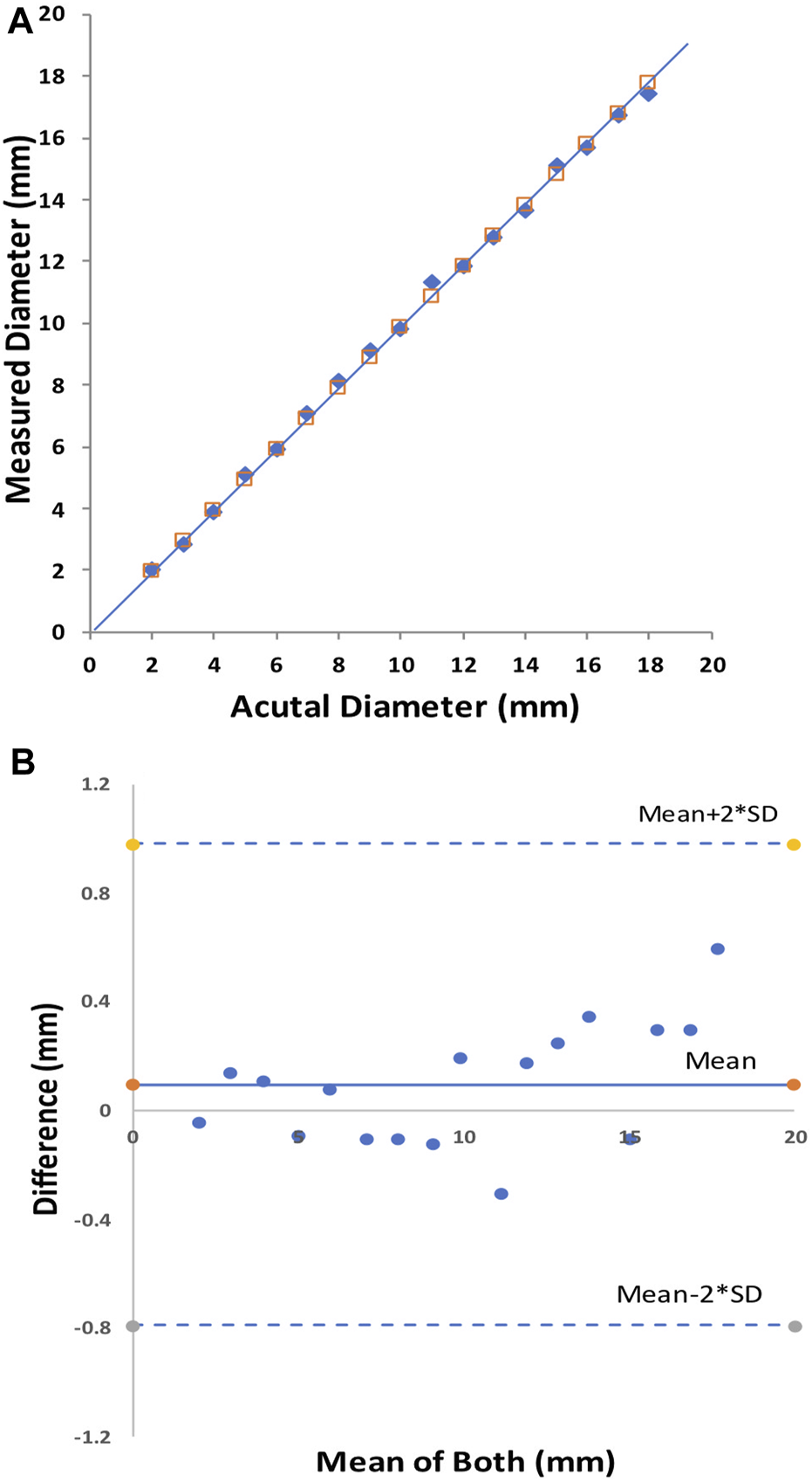 The CMSB bench accuracy in phantoms from 2 to 18 mm. Plot shows the identity relationship between the CMSB measured diameter and the actual diameter (solid black line as the identity line) (A) and the Bland-Altman analysis (B).