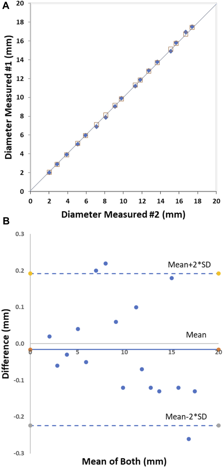 The CMSB bench repeatability in phantoms from 2 to 18 mm. Plot shows the identity relationship between the CMSB measured diameter and the actual diameter (solid black line as the identity line) (A) and the Bland-Altman analysis (B).