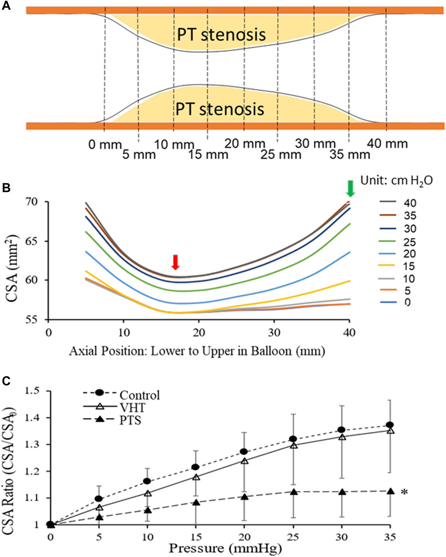 A balloon inflated by stepwise pressures changed the luminal CSA of a PT stenosis. (A) Illustration of PT stenosis formed in the femoral vein in the animal model. Both ends of the venous segment are venous lumen without stenosis. (B) An example of luminal CSA increased heterogeneously along the stenosis when a balloon catheter was placed at the stenosis and inflated by stepwise pressures. The CSAs at different balloon positions delineate the stenosis’s contour. The venous CSA and the filling pressure showed a characteristic non-linear relationship. It implicates heterogeneous stiffnesses of the venous segment at different positions. The site of the largest PT stenosis was the least compliant (red arrow), and the non-PT portion of the vein proximal to the PT stenosis was the most compliant (green arrow). (C) Venous compliance (the circumferential stretch ratio versus pressures relationship) at three states: control (Control), venous hypertension-induced tricuspid injury (VHT), and PT stenosis (PTS). Here the circumferential stretch ratios (CSA/CSA0) were the average of the ratios over the balloon length. *: p < 0.05 (ANOVA) in comparison with Control or VHT.