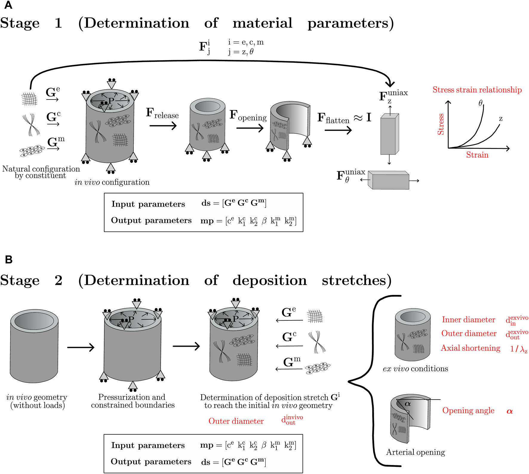 To provide a clear description of the iterative procedure, we first distinguish two main stages (Figure 3), each of them aiming to the determination of: the set of materials parameters mp (Stage 1, Figure 3A) and the deposition stretch values ds (Stage 2, Figure 3B).