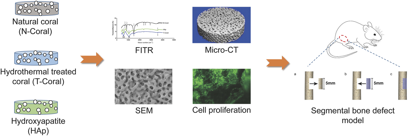 Finally, the hydrothermally treated coral group (T-Coral) samples were obtained. An equal volume of hydroxyapatite (HAp, PENTAX Co., Japan) porous material with similar porosity was used as the control group samples.