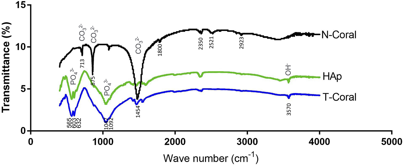 FIGURE 2. Fourier transformed infra-red spectroscopy (FTIR) spectra showing signature waveforms of CO2−3, PO43−, and OH− of the porous scaffolds, including nature coral (N-Coral), hydrothermally treated coral (T-Coral), hydroxyapatite (HAp).