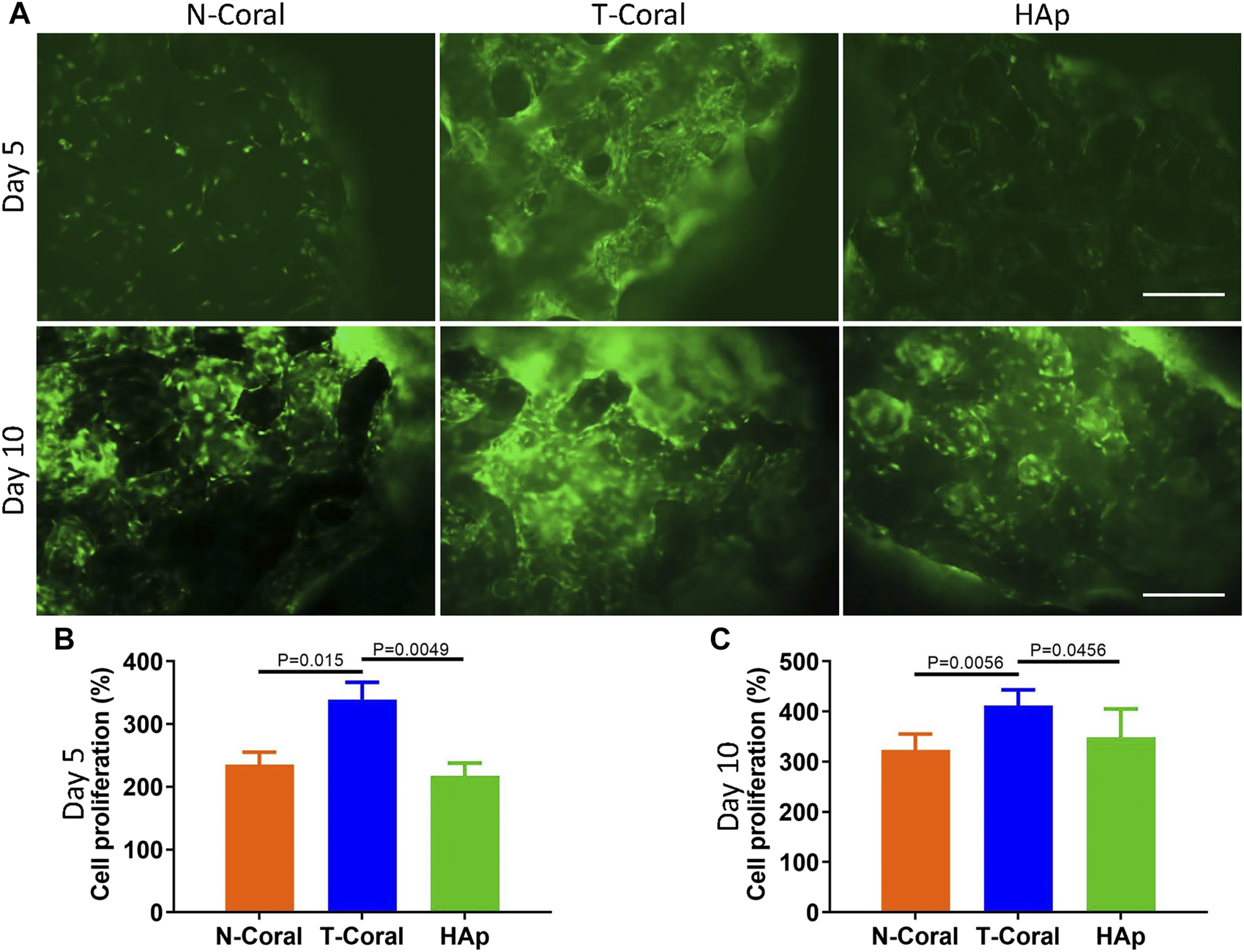 Bone marrow derived MSCs expressing GFP were seeded onto the surface of the porous scaffolds, and the proliferation of MSCs were measured within 10 days (Figures 4, 5). Interestingly, as shown by the results of Alarma Blue assay, the cells proliferated much more vigorously in the T-Coral group, showing significantly higher cell proliferation rate than N-Coral (339.1% vs. 285.5%, p = 0.015) or HAp (339.1% vs. 217.5%, p = 0.0049) on day 5 (Figures 4A, B), and significantly higher cell proliferation rate than N-Coral (421.0% vs. 323.2%, p = 0.0056) or HAp (421.0% vs. 438.7%, p = 0.0456) on day 10 (Figures 4A, C) than the N-Coral or HAp group. The SEM images also confirmed that much more cells attached to the surface of T-Coral than other two groups (Figure 5). The gene expression results showed a significantly higher expression of Runx2 (p = 0.031 & p = 0.014) after 3 days, and higher expression of Ocn (p = 0.001 and p = 0.039) after 7 days of osteogenic differentiation in the T-coral, comparing to the N-coral and HAp groups (Figure 6).