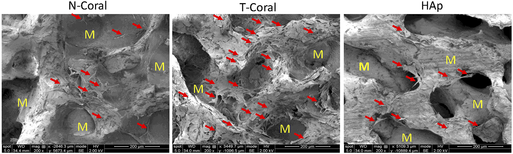 FIGURE 5. SEM images of GFP expressing MSCs seeded on the porous scaffolds on day 5. Red arrows indicate attached cells and M represents material. Magnification: ×200.