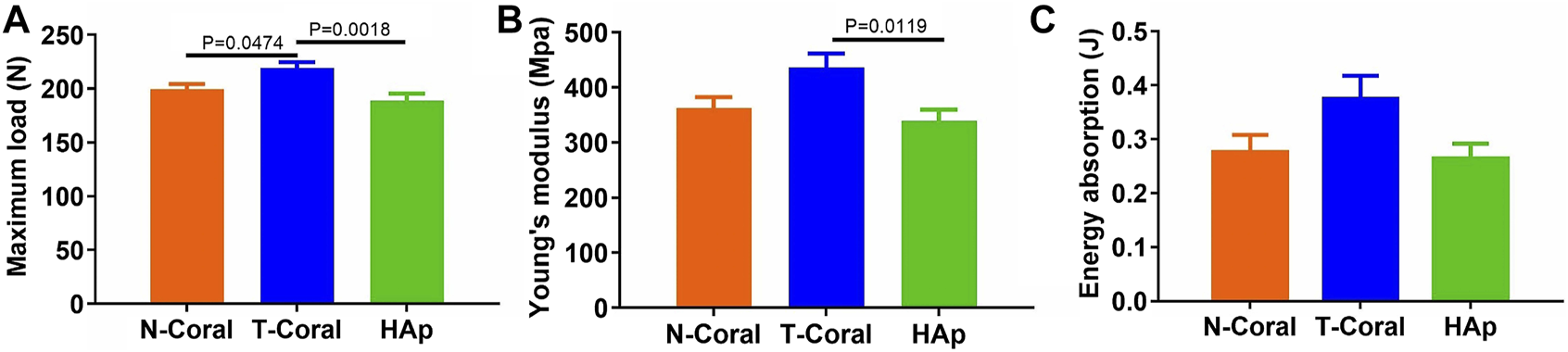 More importantly, results from four-point bending mechanical test reveal that significantly higher maximum load in the T-Coral group than the N-Coral (219.2 vs. 199.7, p = 0.0478) or HAp group (219.2 vs. 189.1, p = 0.0018) (Figure 8A). And a significantly higher Young’s modulus could be found in the T-Coral group than the HAp group (436.1 vs. 338.9, p = 0.0119) (Figure 8B). However, there is no significant differences in the energy absorption among the groups (Figure 8C).