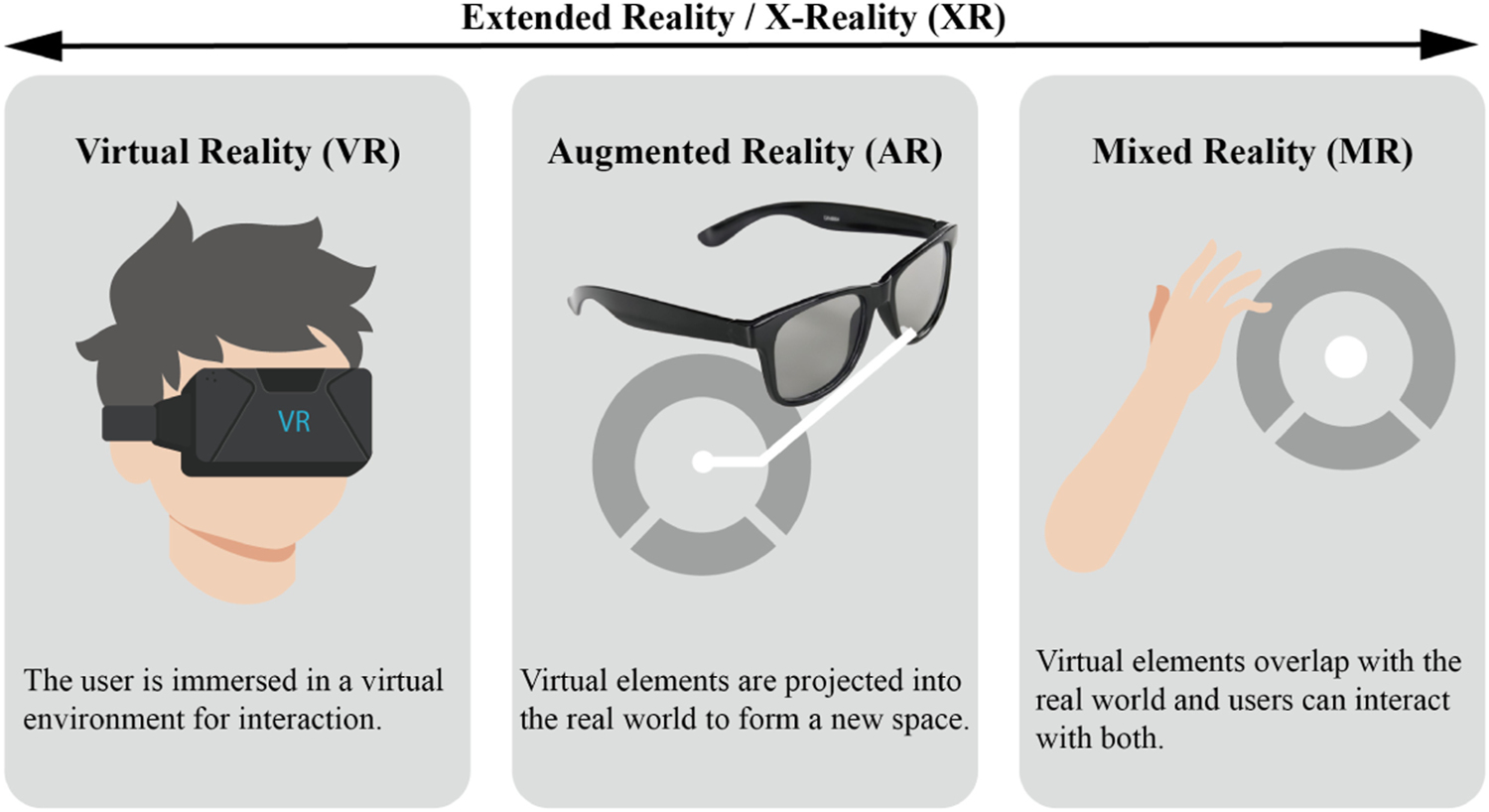 FIGURE 1. Illustrations showing the relationships and definitions between the most common realities (extended reality, virtual reality, augmented reality and mixed reality).