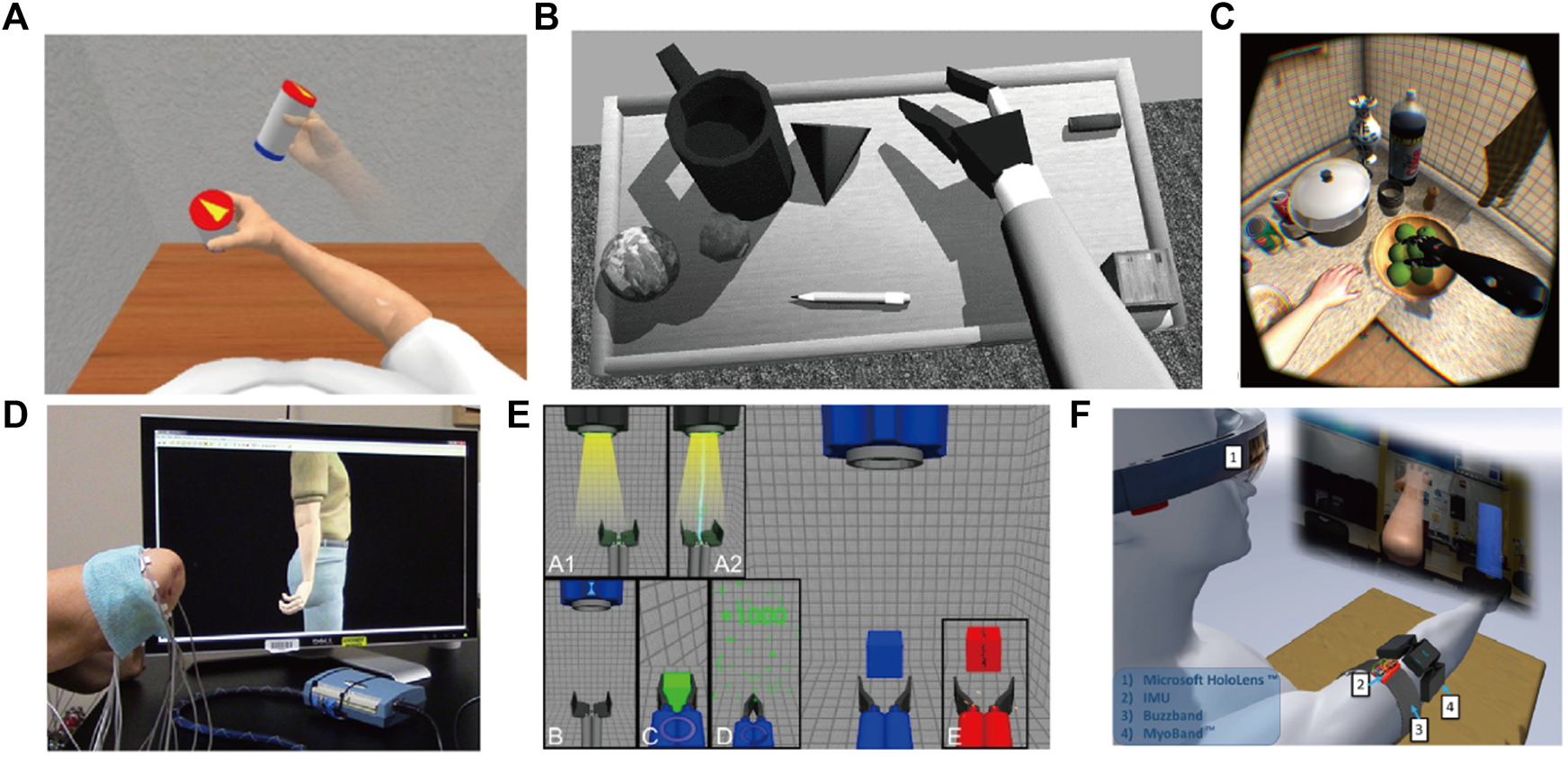 FIGURE 3. Simulation tasks: (A) VRd testing environment; (B) Prostheses simulator; (C) Exploration; (D) VIE; (E) Catching simulator Prostheses Gripper; and (F) Mixed reality training.