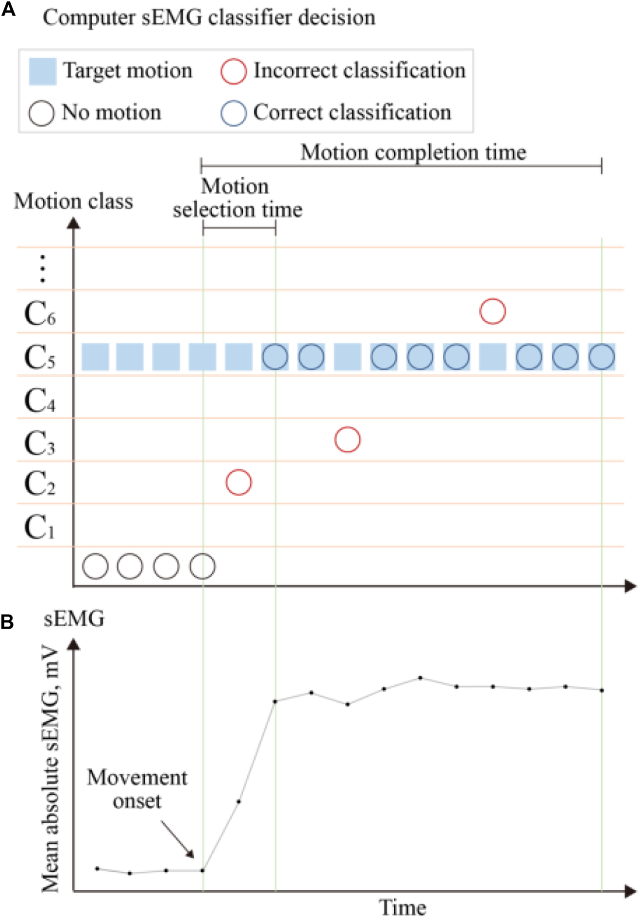 FIGURE 5. Definition of the real-time performance metrics. The mean absolute values of the sEMG signals used to generate control commands are shown at the (B). The (A) present the control decisions generated in response to the sEMG signal classifier and corresponding performance metrics. The blue boxes indicate the target motion. The control decisions are represented by three circles, with black circles indicating decisions with no motion, blue circles indicating decisions with correct classification, and red circles indicating decisions with incorrect classification. The performance metrics shown include motion selection time and motion completion time.