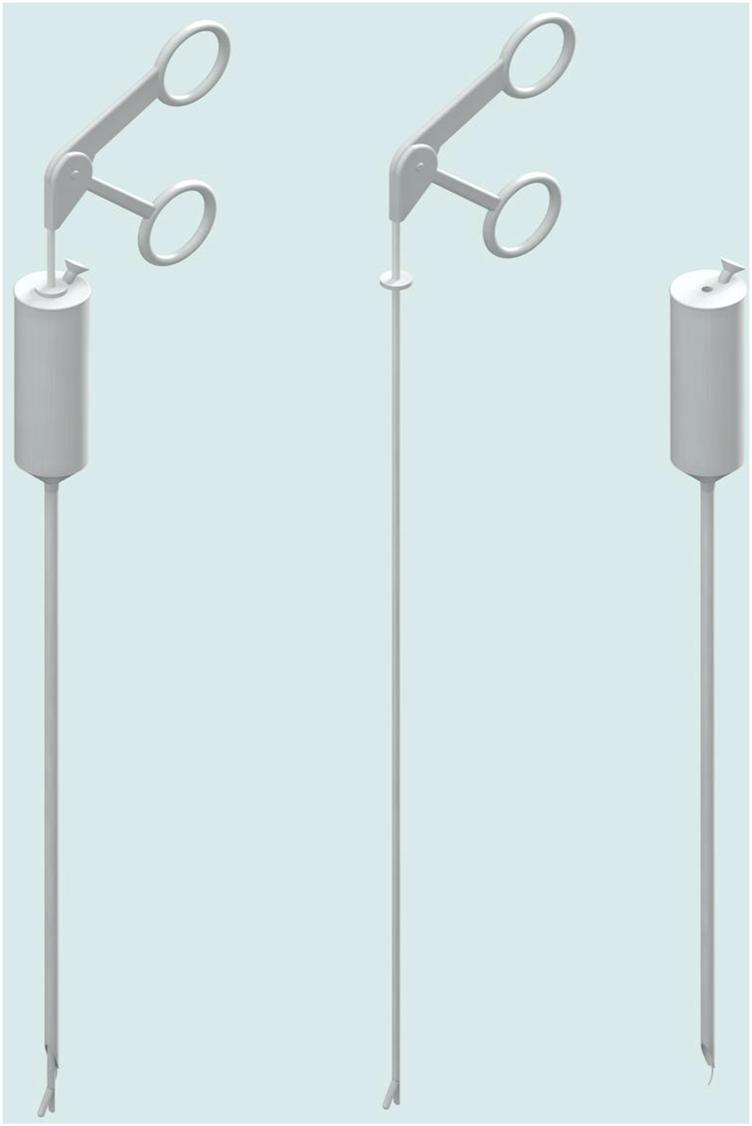 In this study, we utilised an ACD fabricated by our research group (Figure 1). The ACD is divided into the grip, the needle body and the puncture head. The handle and needle body are made of 304 stainless steel with a length of 200Â mm. The diameter of the internal sewing channel is 0.75Â mm, and the diameter of the wire pick-up pliers channel is 2.8Â mm. The length of the matching wire pick-up pliers is 280Â mm.