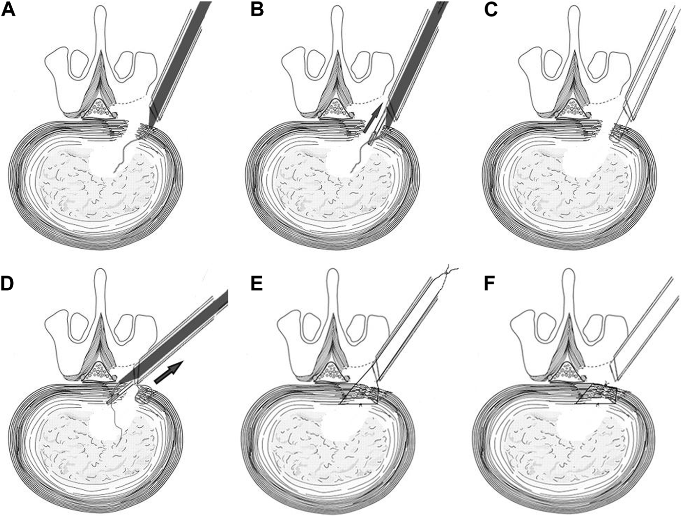 3) Puncture: Puncture the tip into the edge of one side of the broken AF under direct vision and push the ACD to enable the puncture needle and suture to enter the disc.