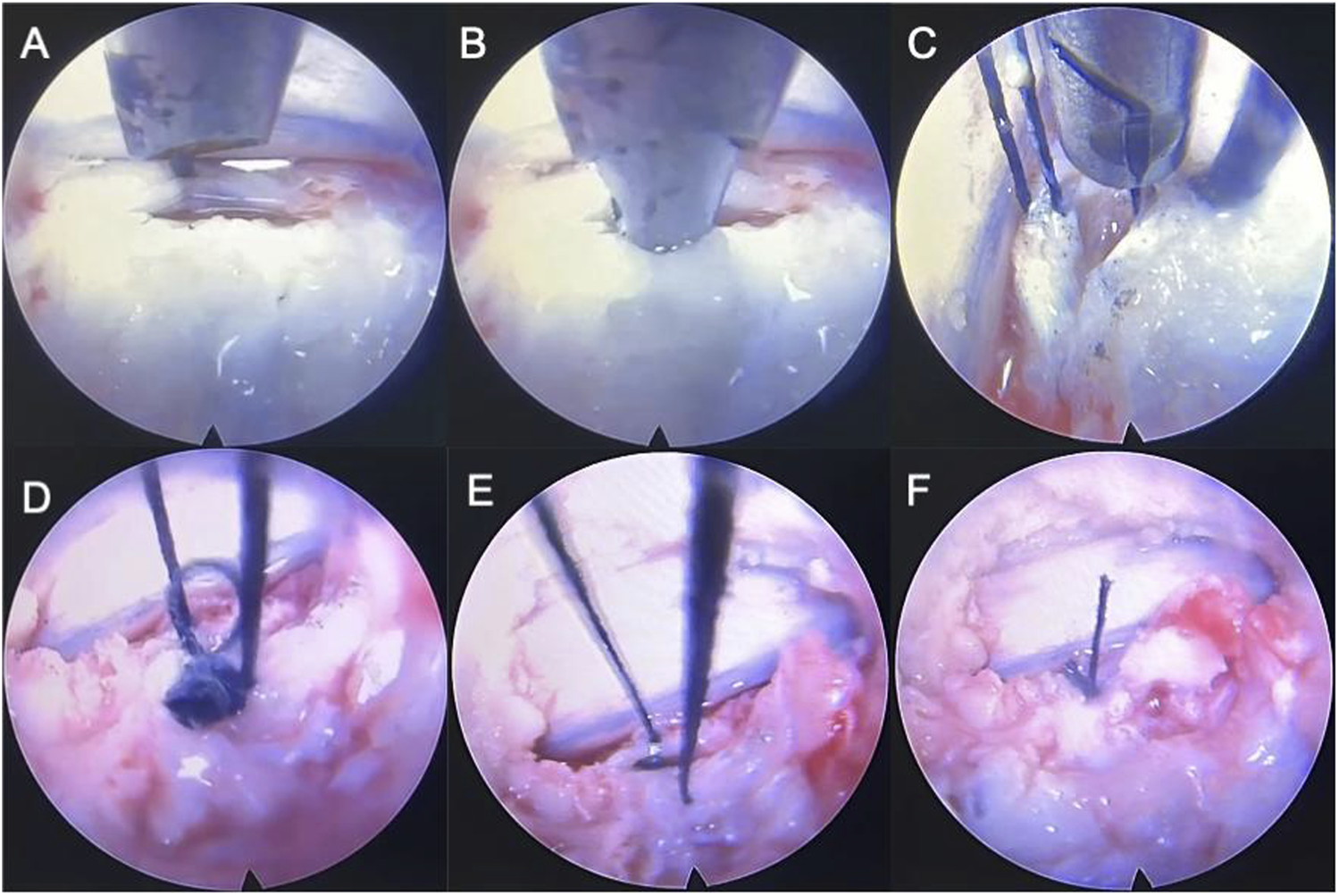 Simulation of a fully endoscopic suture of sheep IVD model. (A) puncture; (B) clip and pull the suture line; (C) repeat on the contralateral side; (D,E), (F) knot the middle two lines, pull the outer two lines to bury the knot into the disc, then knot the outer two lines, and use a long push knotter to push the knot in and tighten it.