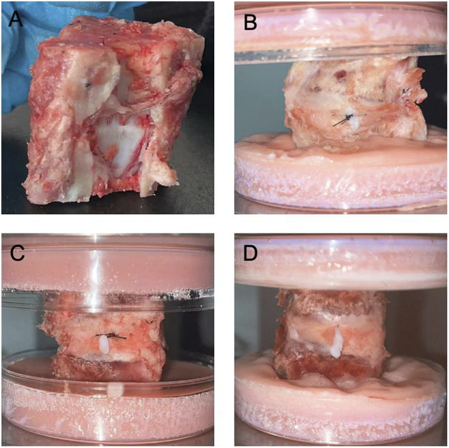 Following completion of the suture operation, the FDU was placed in a mould to fix the upper and lower vertebrae with dental powder to ensure uniform force. Record the load-displacement curves, failure load readings (peak readings) and NP leakage (Figure 4).