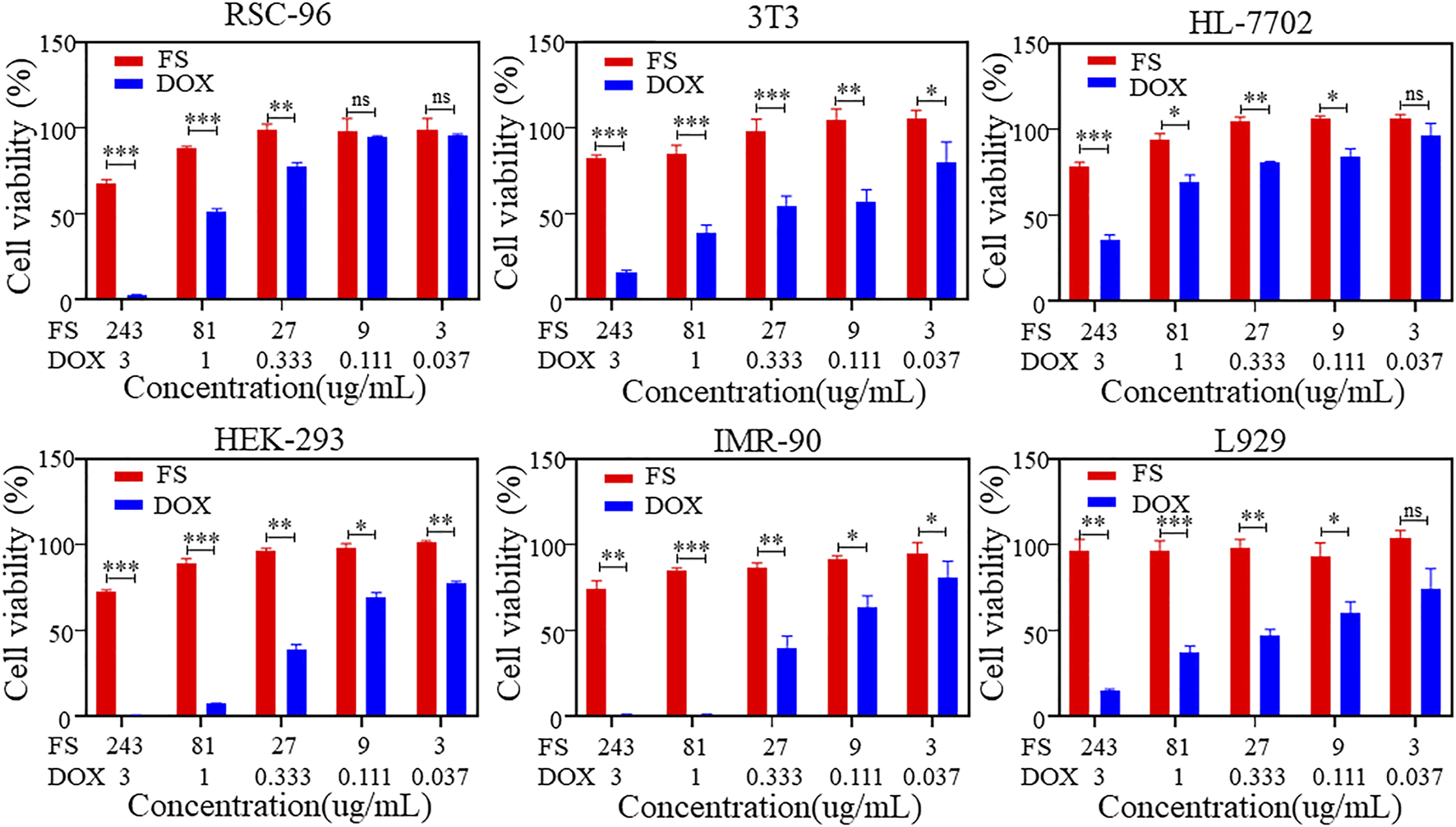 The biocompatibility of SIM is a crucial consideration in biomedical applications. To assess the cytotoxicity of FS hydrogels, we analyzed the cell viability of various cell types using the CCK-8 cell proliferation assay. Figure 2 displays the results of the cytotoxicity assay for rat Schwann cells (RSC-96), mouse embryonic fibroblasts (3T3), human normal hepatocytes (HL-7702), human embryonic kidney cells (HEK-293), embryonic lung fibroblasts (IMR-90), and mouse epithelioid fibroblasts (L929). Under the condition of gradually increasing DOX concentration, the cell viability of all three groups, RSC-96, HEK-293 and IMR-90, gradually decreased to 0, while the cell viability of the other three groups decreased to less than 50%, indicating significant cytotoxicity. The cell viability of the three groups of temperature-sensitive hydrogels also slightly decreased. However, increasing the concentration of the hydrogel material to 243 μg/mL resulted in a cell survival rate of over 50% for each group. This indicates that the temperature-sensitive hydrogel has low cytotoxicity and maintains relatively high biosafety performance even at higher concentrations.