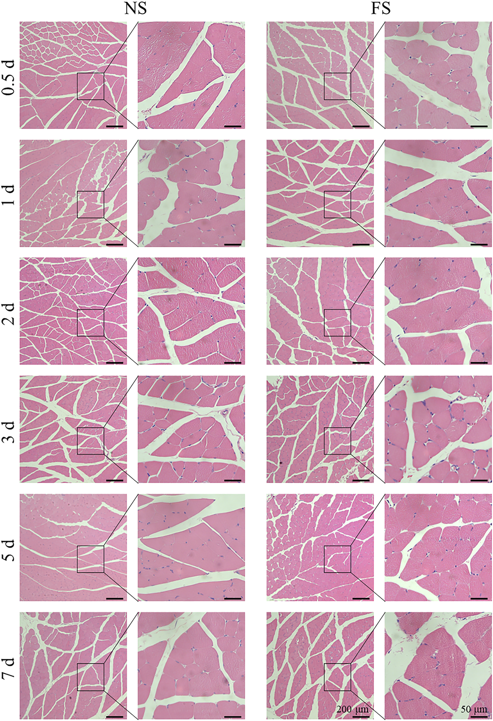 Damage to muscle tissue by the FS hydrogels. NS, normal saline.