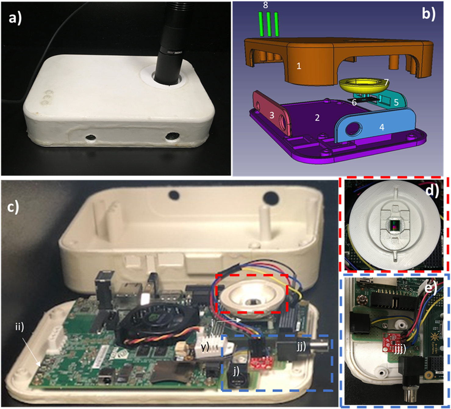 Imaging module design. (A) Closed view of the prototype, (B) CAD exploded view of the system enclosure designed for the protection of the imaging device, (C) open view of the embedded system, (D) overview of the culture area and (E) zoomed view of the added connectors and circuits. The casing was designed specifically for the purpose of protecting the electronic components from shocks and humidity. In addition to the casing, a thin coat of silicone (Leak Seal, Rust-Oleum) has been applied to both sides of each printed piece. The casing is formed of eight different components that easily “click” together. The top (1) and bottom (2) hold the three side panels (3–5) while parts (6) and (7) are screwed from under the image sensor’s PCB as showed in i). Three copies of part 8 are slid in the top part (1) to allow button controls on the Jetson development board (ii) and are held by the silicone coat. In addition to the already present power, usb3 and ethernet connectors, 9 pins (j) and a BNC (jj) connectors have been added inside the case. The BNC is connected to the DAC (jjj) in order to modulate the input to the LED driver (DC2100, Thorlabs Inc., USA) while the 9 pins connector is only connected to the necessary I2C pins of the Jetson development board (Figure 2E). Additional pins have been left available for future features. A humidity and temperature sensor (y) was fixed with “hot glue” on top of the Jetson.