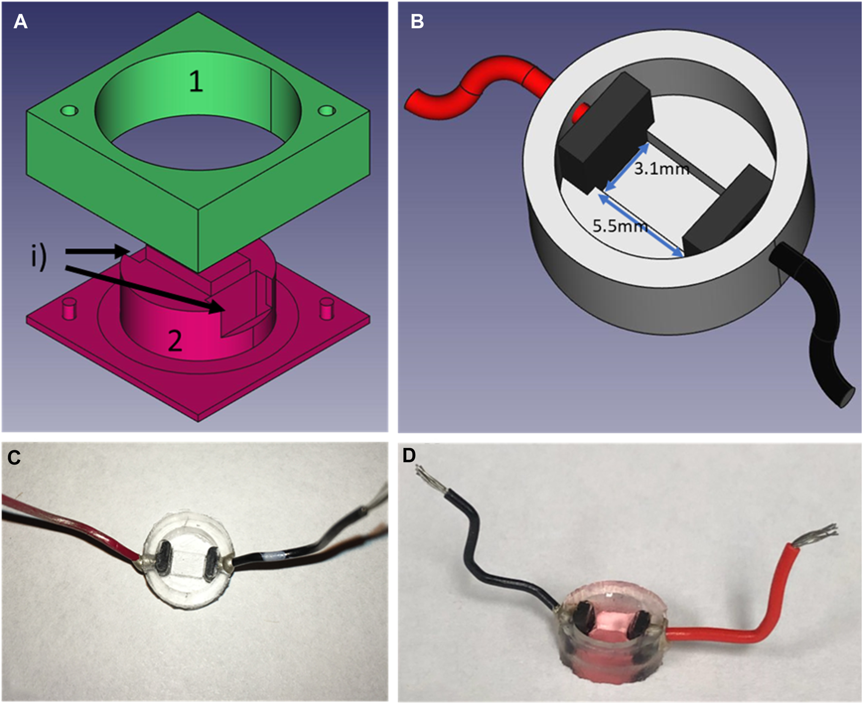 Design of the PDMS culture well. (A) CAD exploded view of the mold use to create the wells, (B) is the CAD representation of the culture wells with electrodes and wires for field-stimulation, (C) is a picture of the wells in PDMS after unmolding and (D) the well filled with culture medium and seeded with cells. To create the wells, two carbon electrodes are positioned in slots labeled i) after part 1) of the mold is firmly in place on top of part 2). Liquid PDMS is then poured into the mold. To ensure a fixed height for the bottom of the well, part 1 is 0.1 mm taller than part 2. In addition, a cover slip is placed on top of part 1 to ensure a flat finish. The mold is then placed in the incubator at 37° overnight. After unmolding, holes are punctured on the side of the wells to allow the cold soldering of the wires using silver paste (8331-14G, MG Chemicals) and let to cure for a minimum of 4 h. Before seeding, wells are submerged in 70% ethanol and rinsed with dH2O before passed under UV light for a minimum of 30 min.