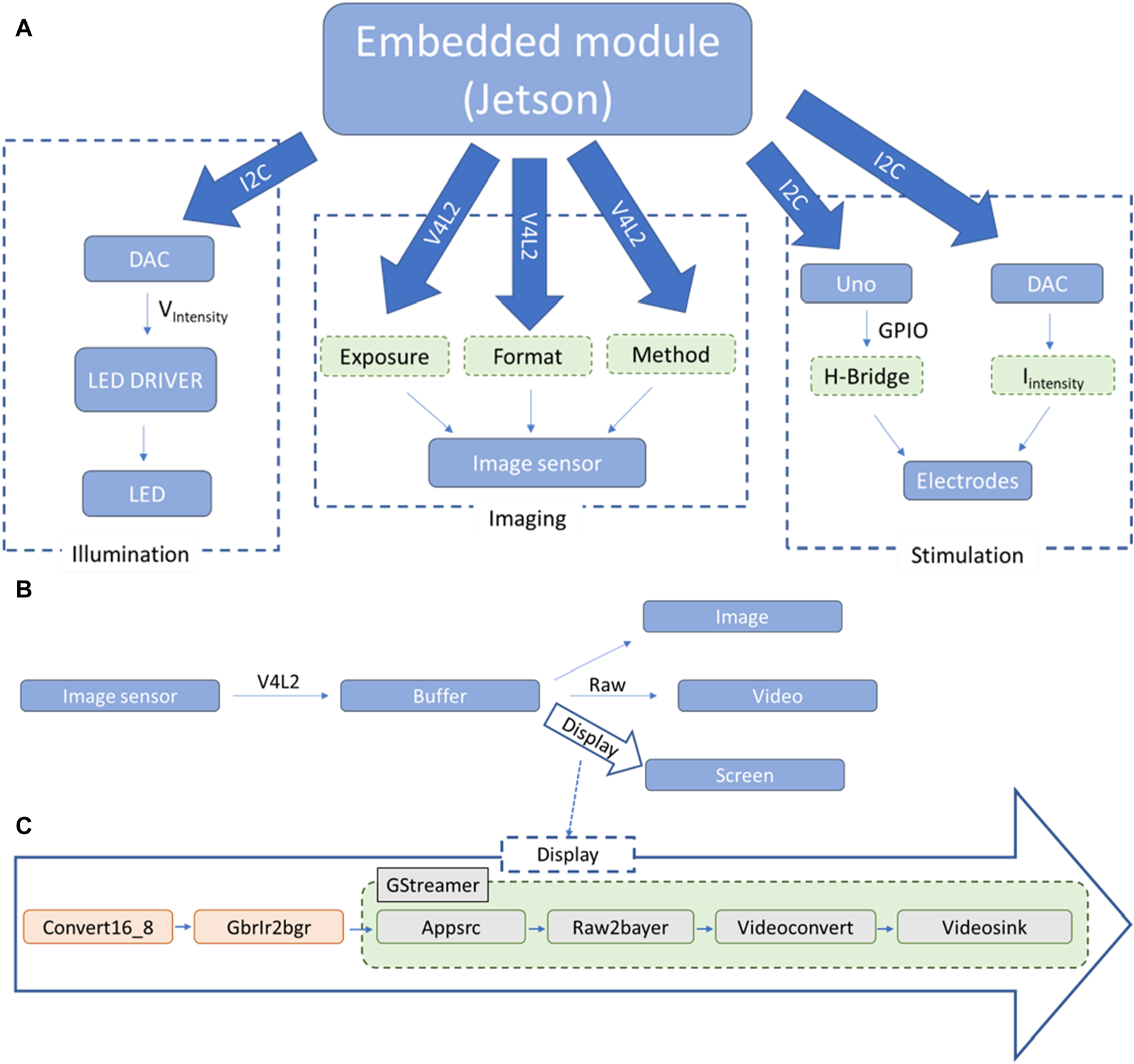 Schematic representation of the high level interactions between the different components of the system: (A) downstream relationship between the main module (Jetson TK1, Nvidia) and the principal systems, (sample illumination, imaging and electrical stimulation); (B) upwards passage of information from the image sensor to the main module; (C) pipeline used for the display of frames on screen. The illumination module relies on the possibility of our LED driver (DC2100, Thorlabs Inc., United States) to be modulated externally by a voltage input. Our program allows communication with a mounted DAC module (MCP4725, Microchip) via I2C communication. With this approach, the LED is turned on only when acquiring images and it is possible to modulate the light intensity when imaging cultures.