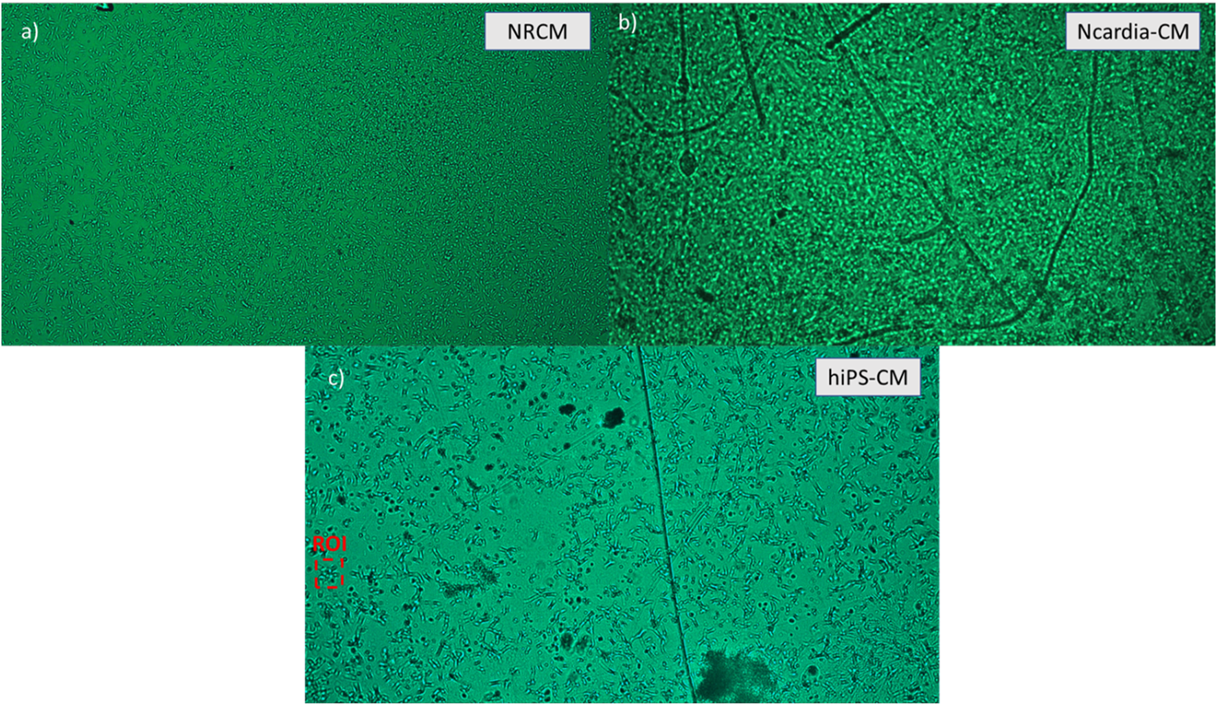 Different cell lines captured and monitored with the device. (A) Neonatal rat cardiomyocytes seeded 3 days prior to imaging at a density of 30,000 cells/well (∼1875 cells/mm2). (B) Ncardia commercial cardiomyocytes derived from human pluripotent stem cells (hIPSC-CM) seeded 4 days prior to imaging at a density of 50,000 cells/well. (C) In house hIPSC-CM, seeded on the PDMS wells 3 days prior to imaging at a density of 5,000 cells/well.